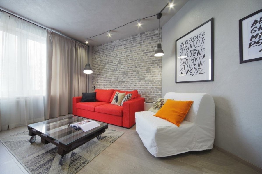 Интерьер гостинной комнаты 17 кв.м лофт