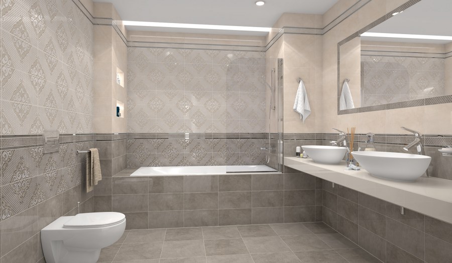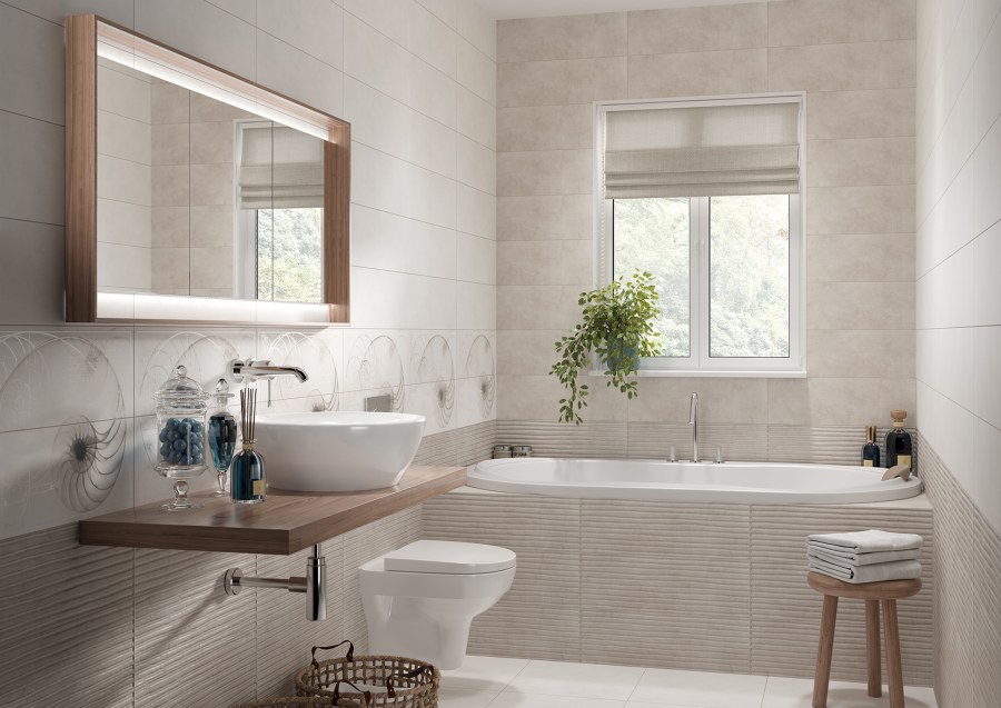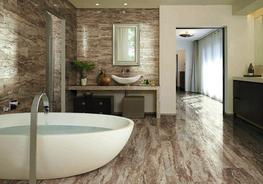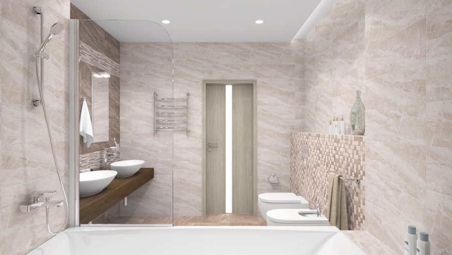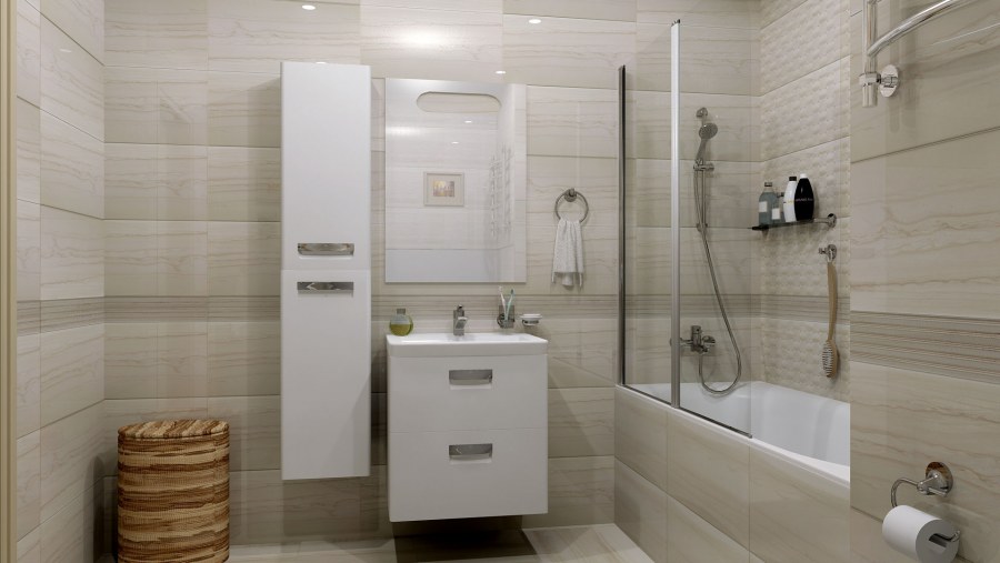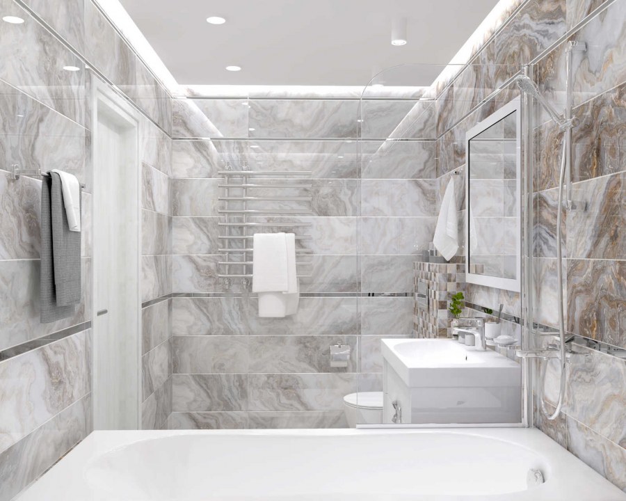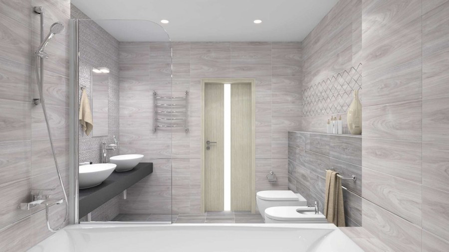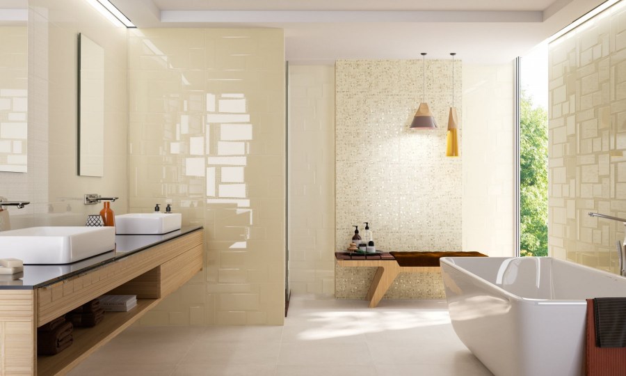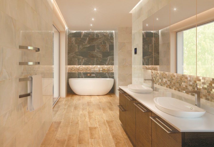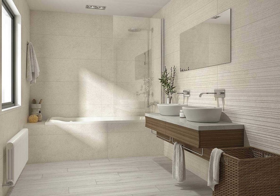Дизайн ванной комнаты светлый керамогранит (72 фото)
