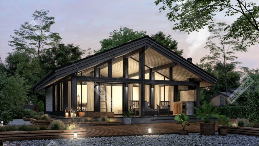 Одноэтажный дом из бруса с панорамными окнами