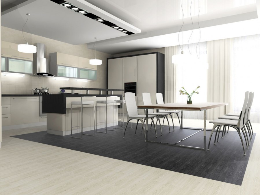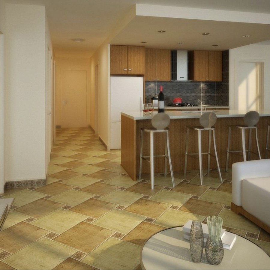 Напольная плитка в интерьере гостиной совмещенной с кухней