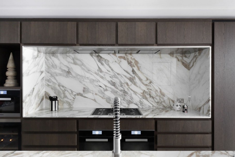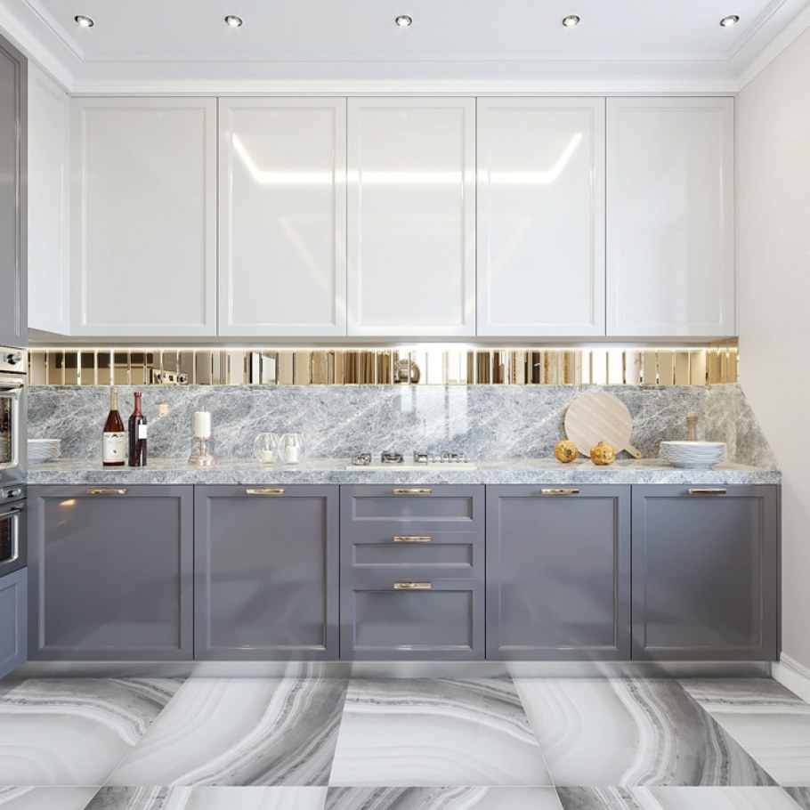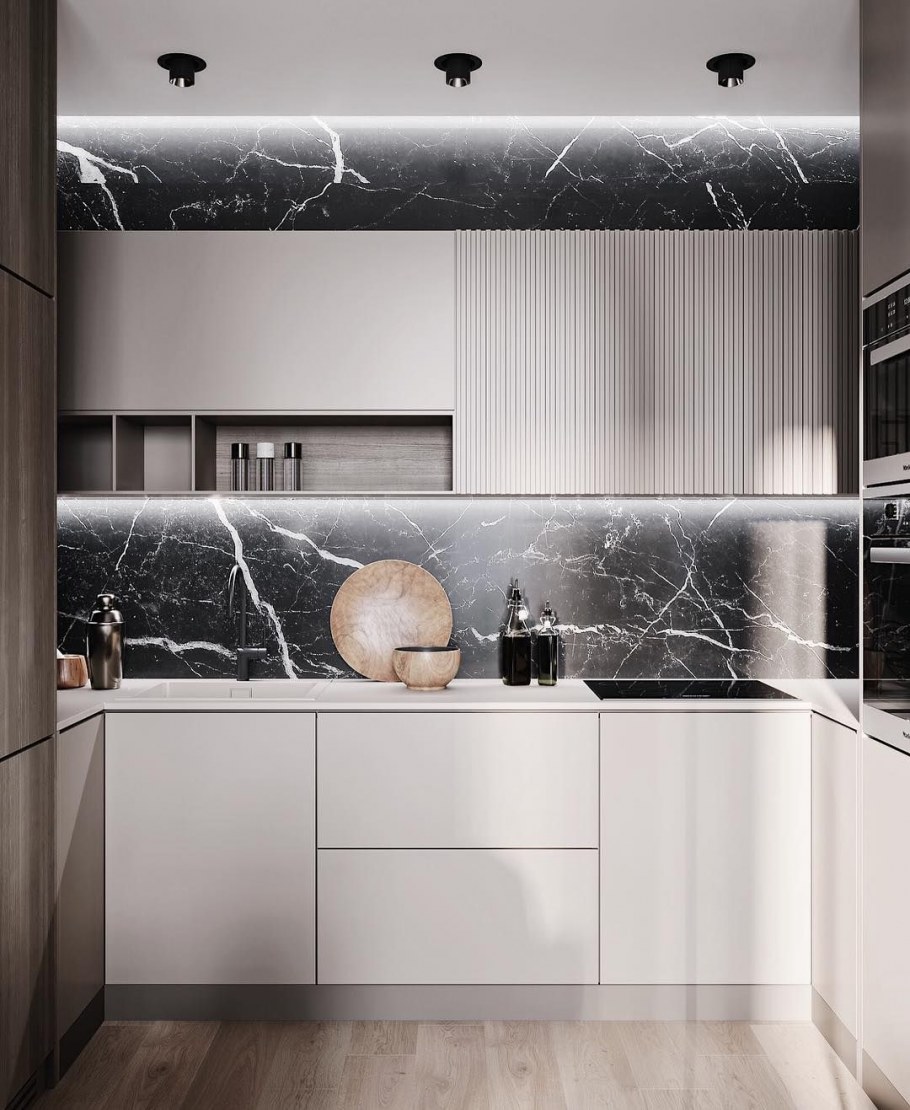 Стеклянный фартук под мрамор для кухни (49 фото)
