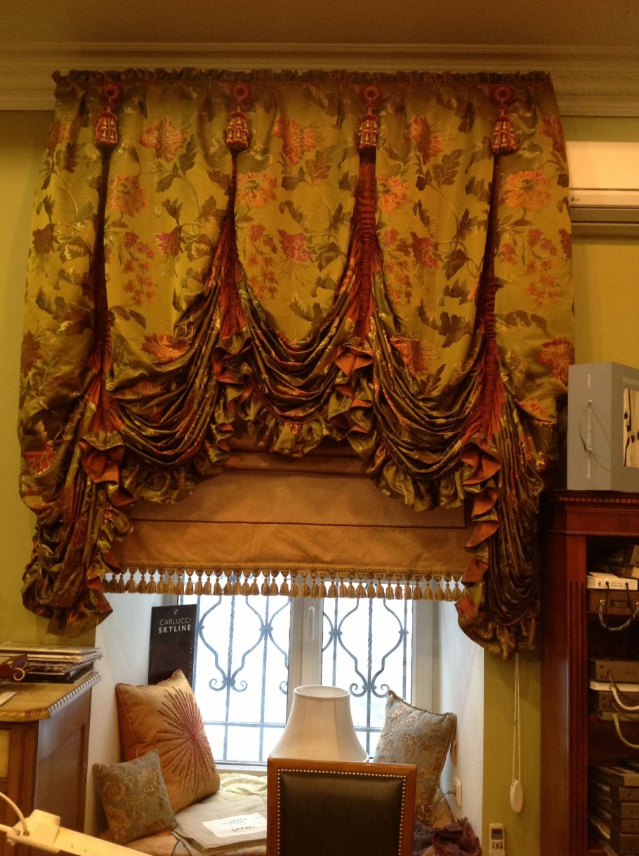 Бордовые шторы в интерьере гостиной с камином в классическом стиле