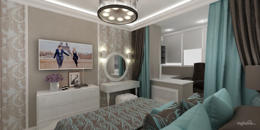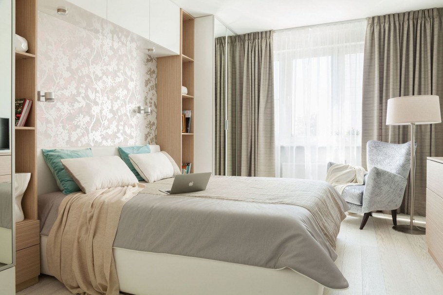 Интерьер спальни с обоями двух видов в бежевых тонах
