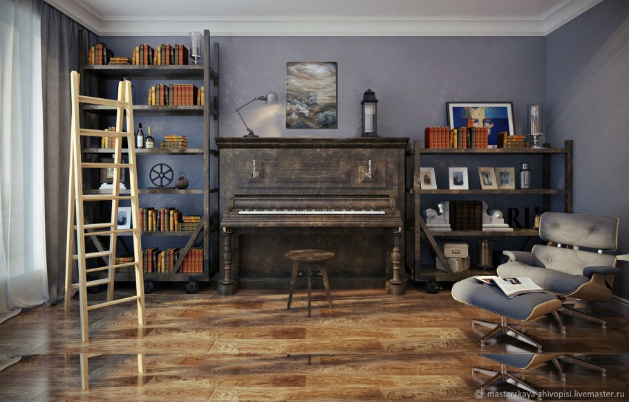 Комната библиотека пианино