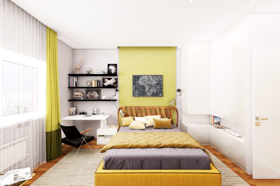 Желтая стена в интерьере подростковой спальни