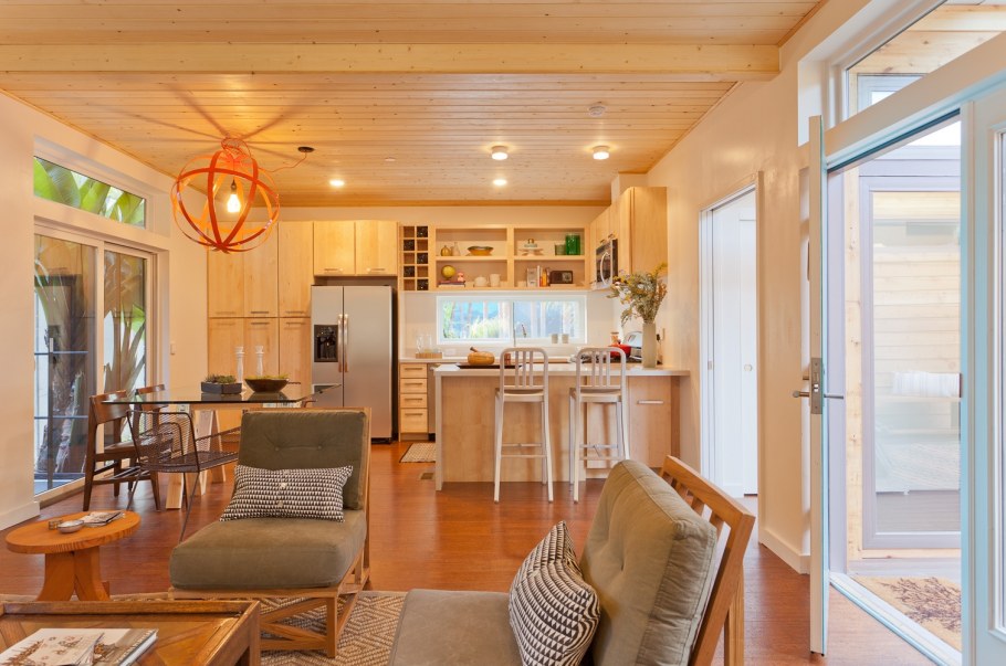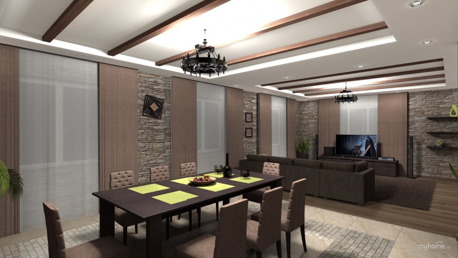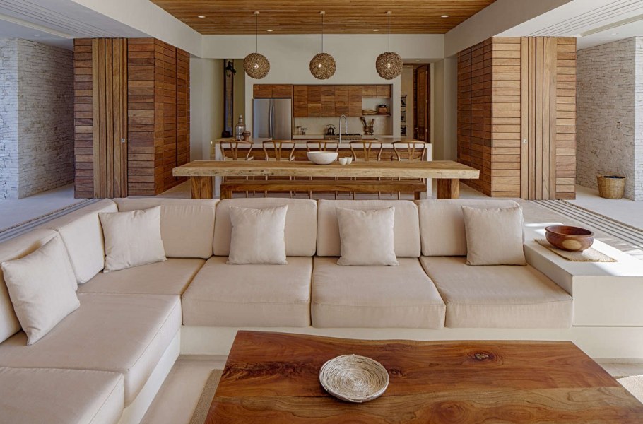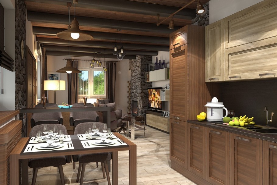 Интерьер из дерева в доме совмещенная кухня с гостиной