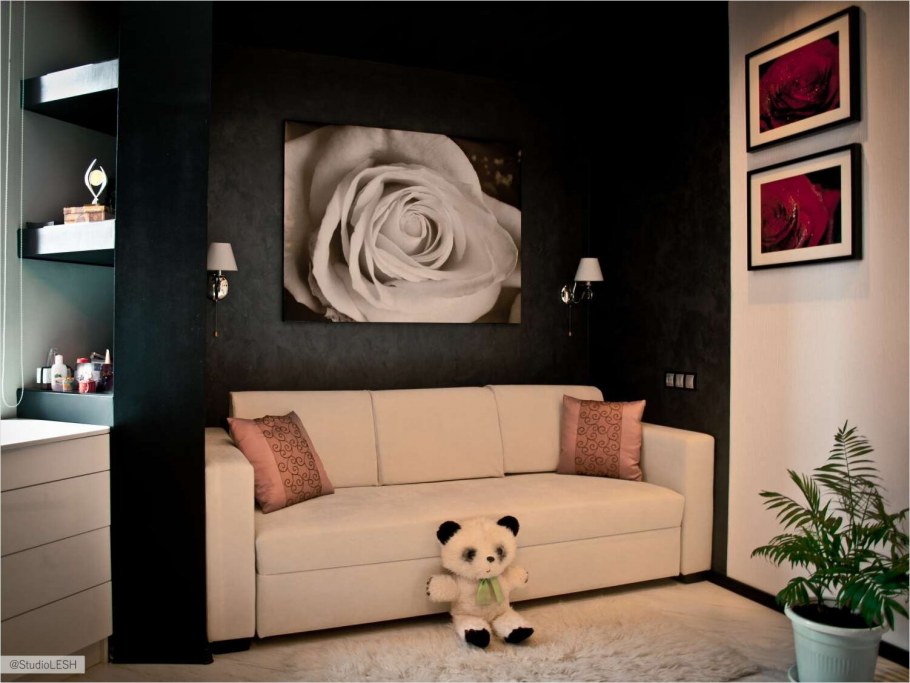 Черный диван в интерьере небольшой комнаты (48 фото)