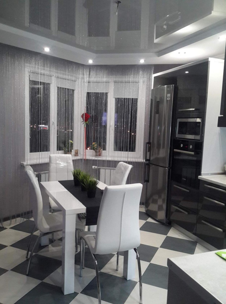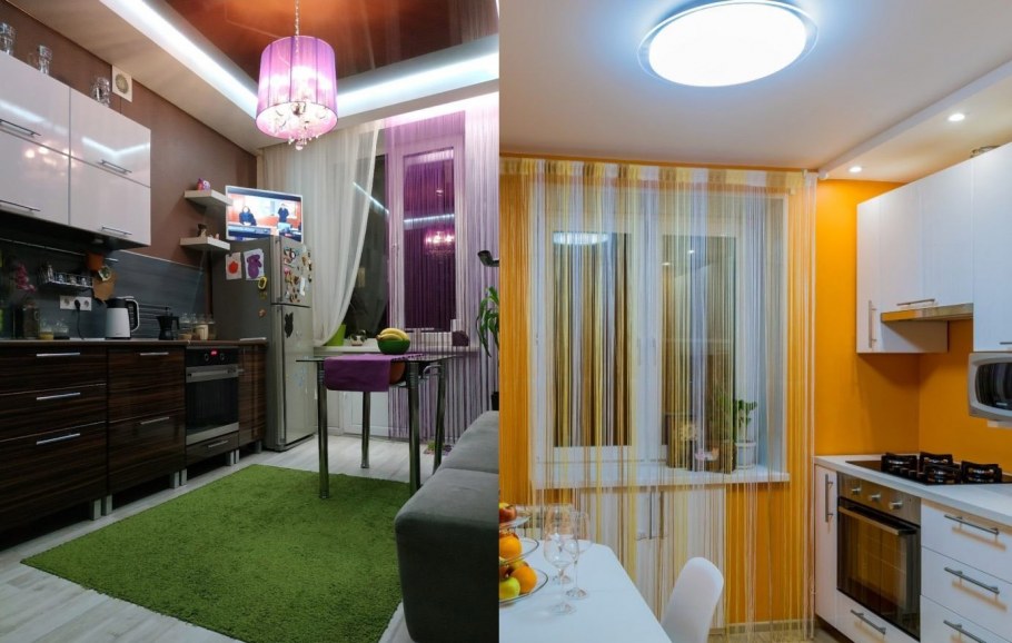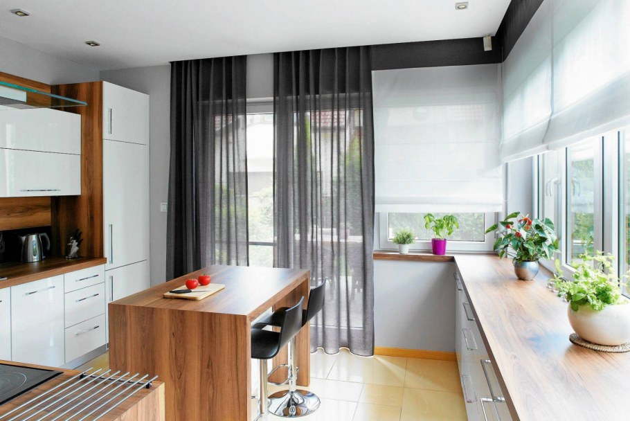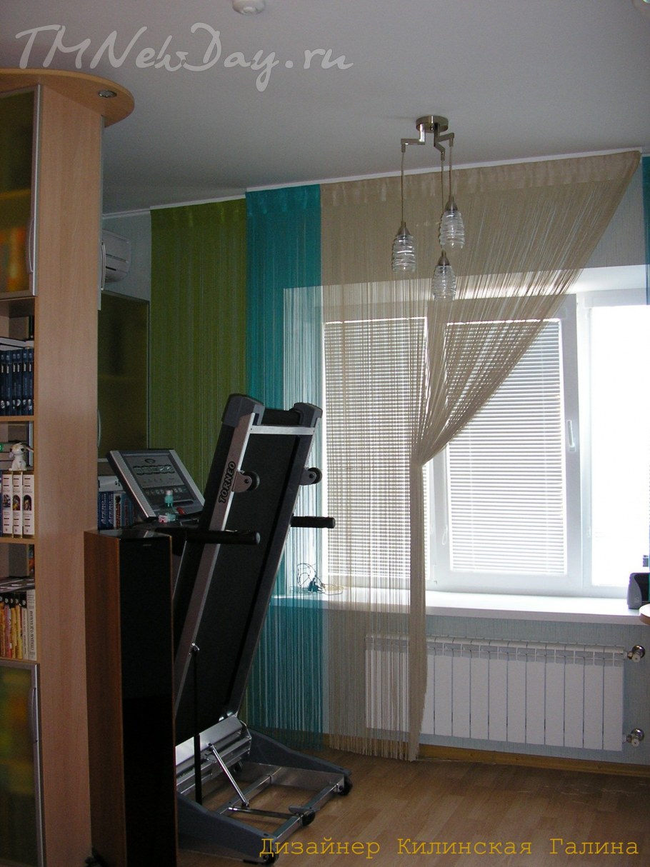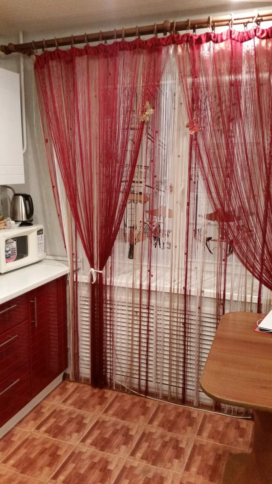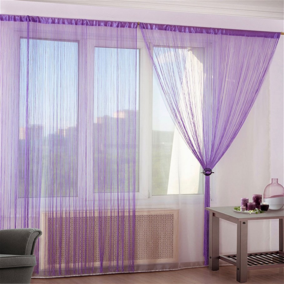 Нитяные шторы в интерьере кухни с выходом на балкон (30 фото)