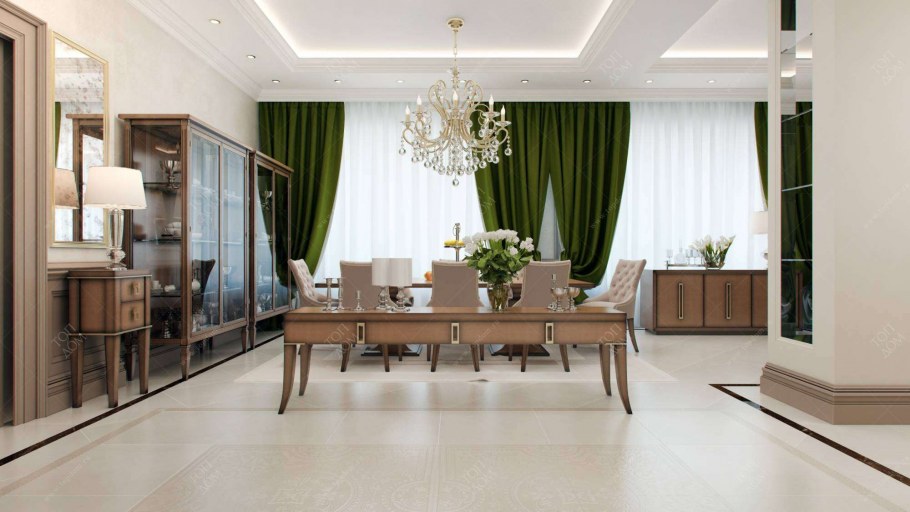 Сочетание зеленых классических штор в интерьере