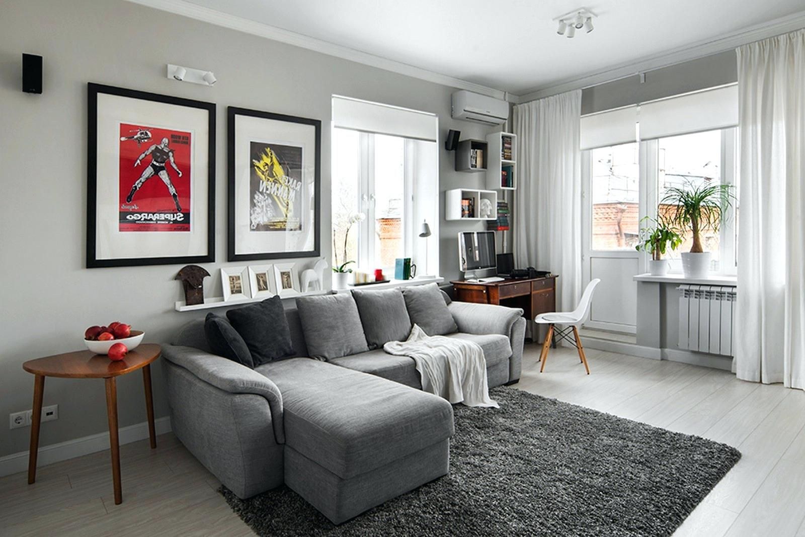 Серый диван в интерьере гостиной