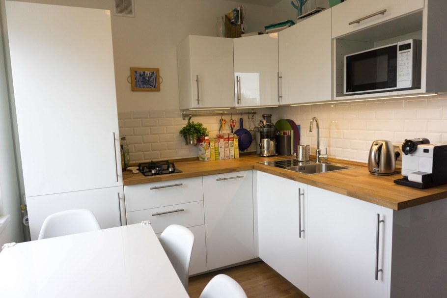 Маленькая белая кухня с деревянной столешницей (46 фото)