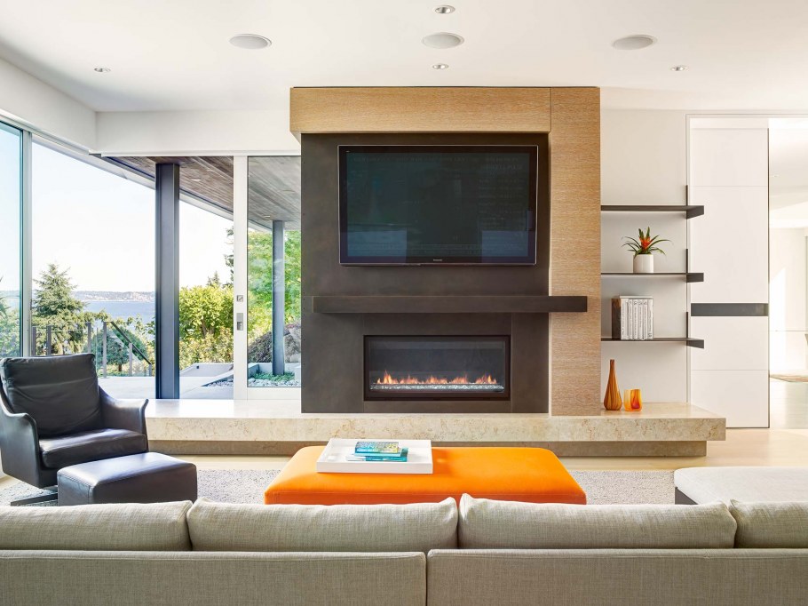 Зона камина в гостиной с телевизором в интерьере (45 фото)