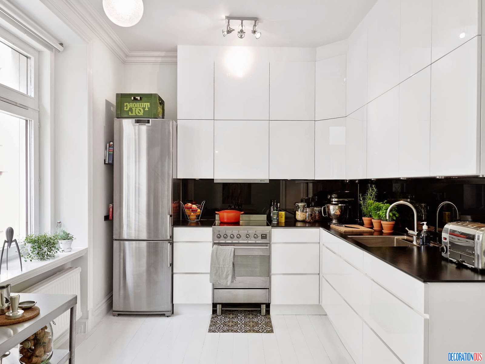 Белая кухня и черный холодильник (40 фото)