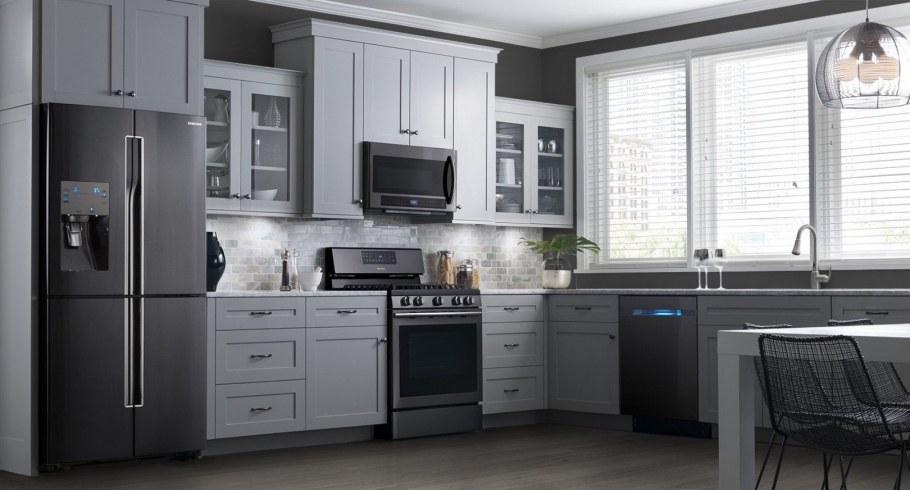 Кухня с черным холодильником