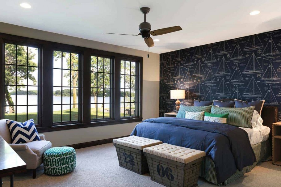 Спальня с синей стеной