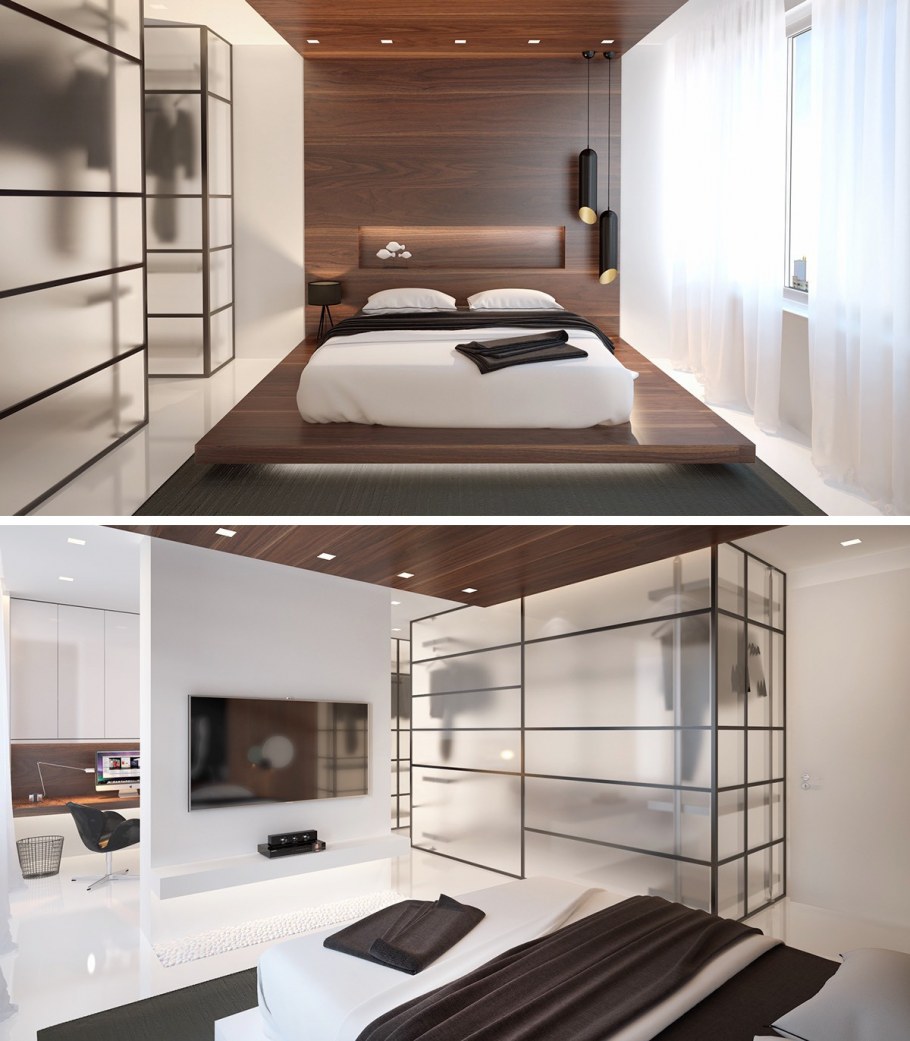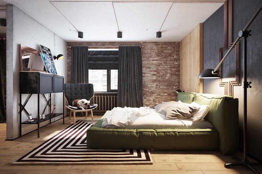 Спальня в стиле лофт со встроенными шкафами (39 фото)