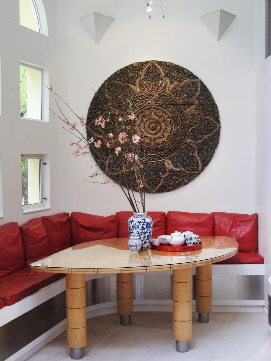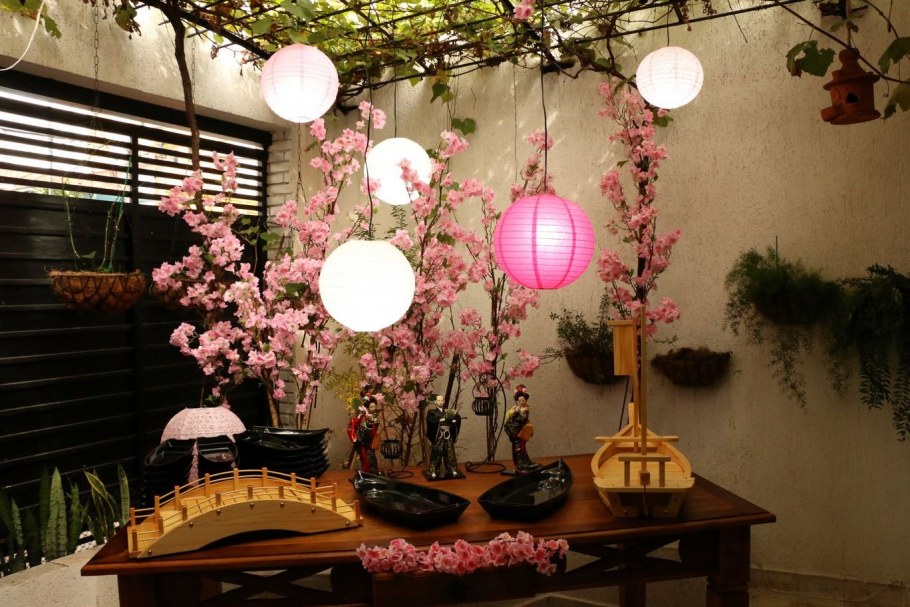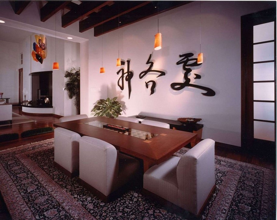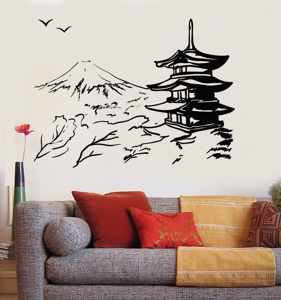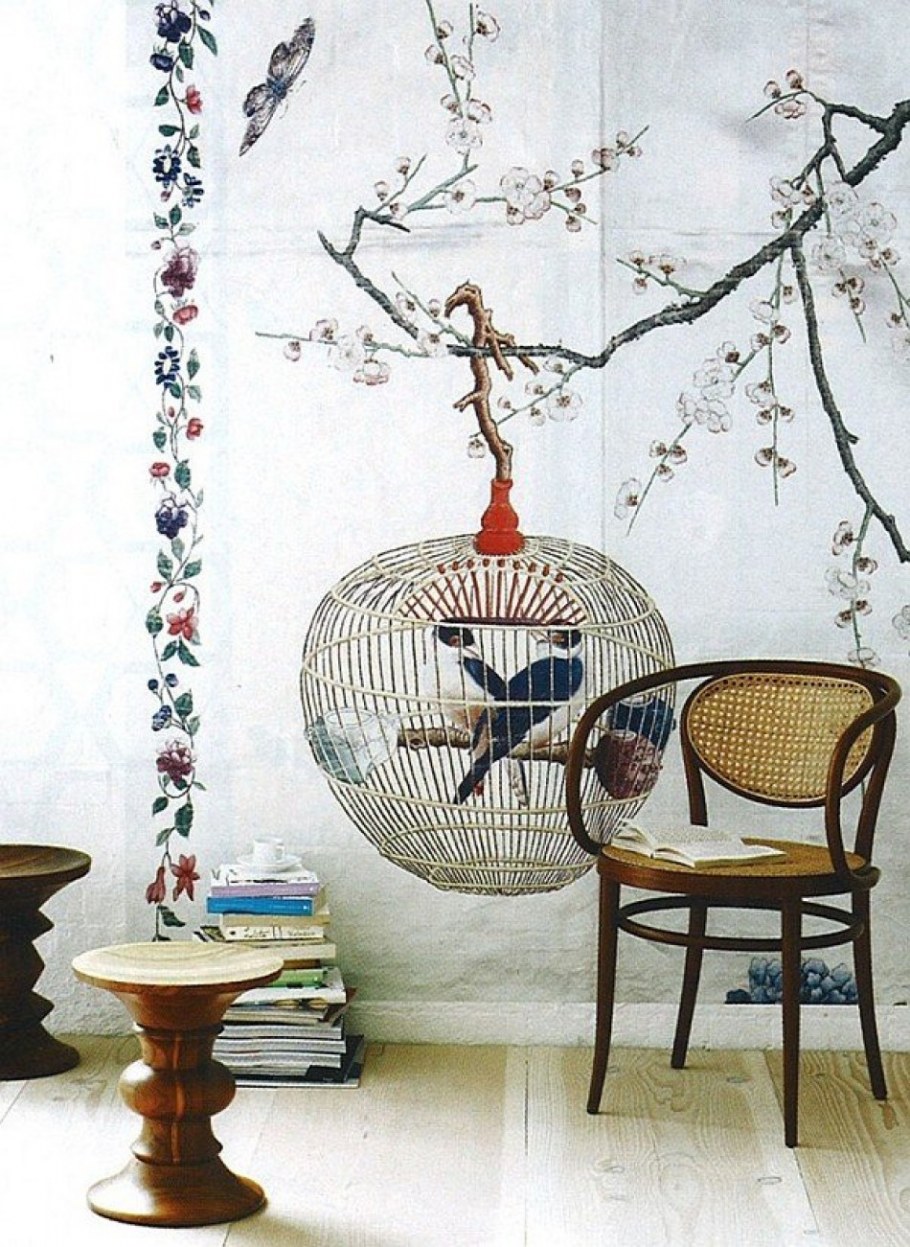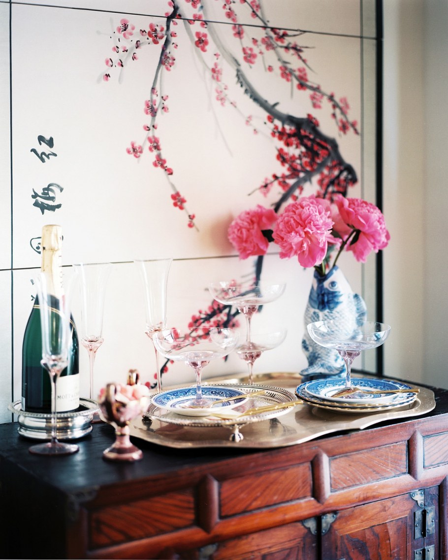 Обои Сакура в интерьере спальни в японском Восточном стиле