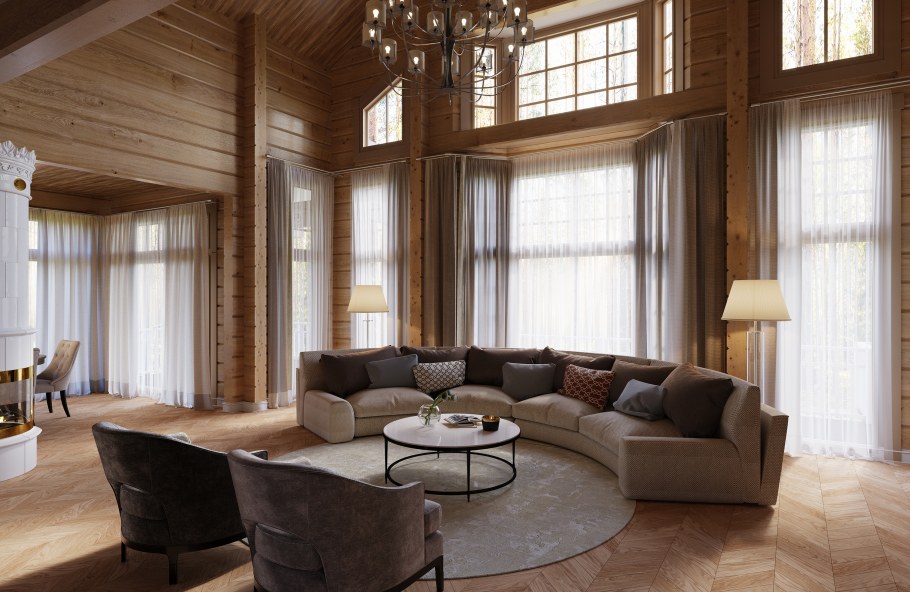 Интерьер гостиной комнаты загородного дома из клееного бруса