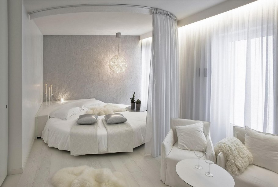 Белая спальня с круглой кроватью