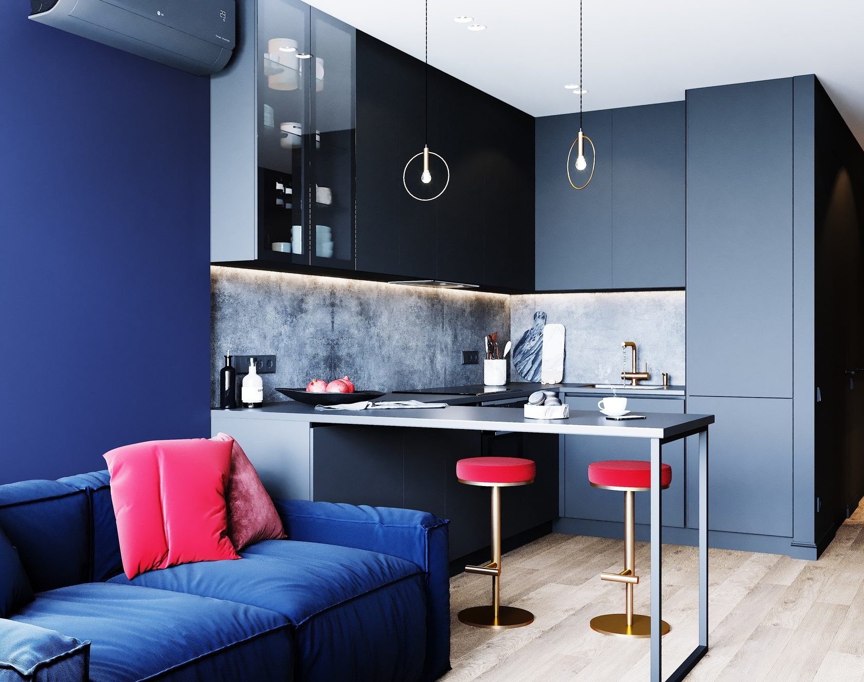 Синяя кухня с черной столешницей