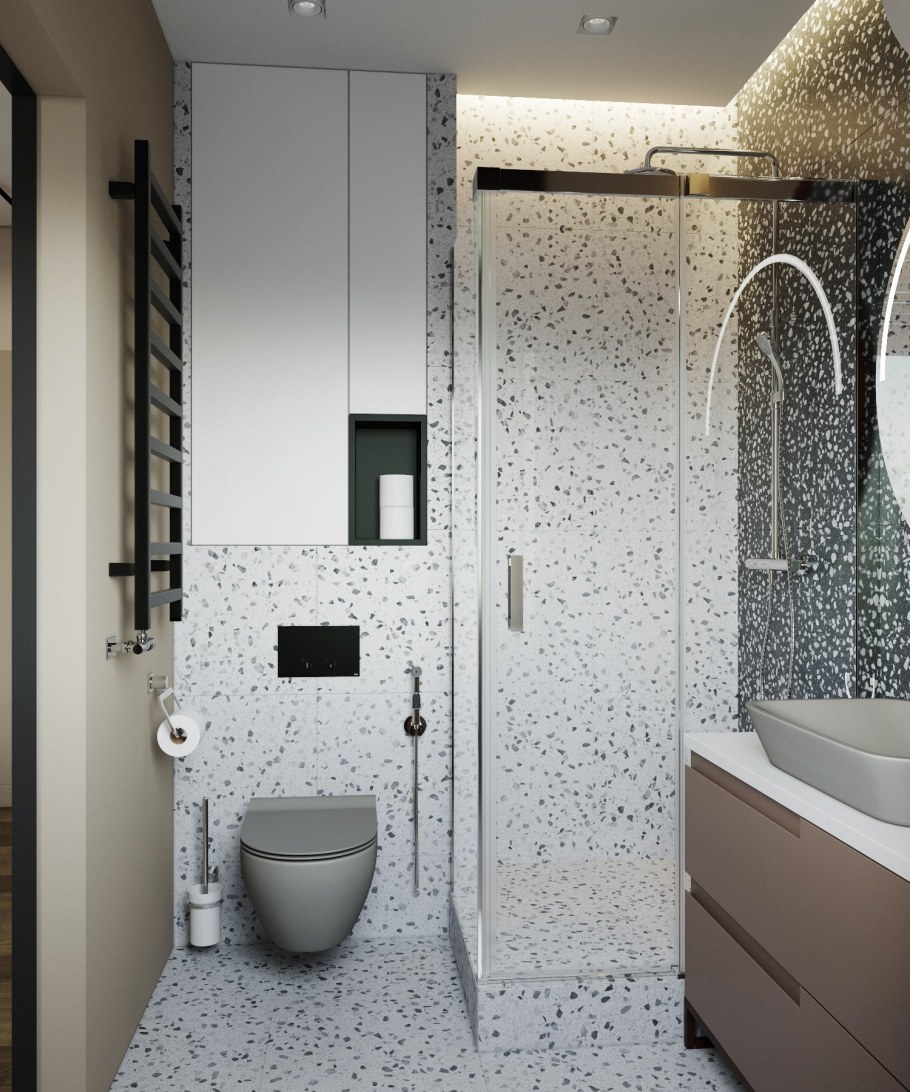 Интерьер ванной комнаты с душевой кабиной совмещенной с туалетом (42 фото)