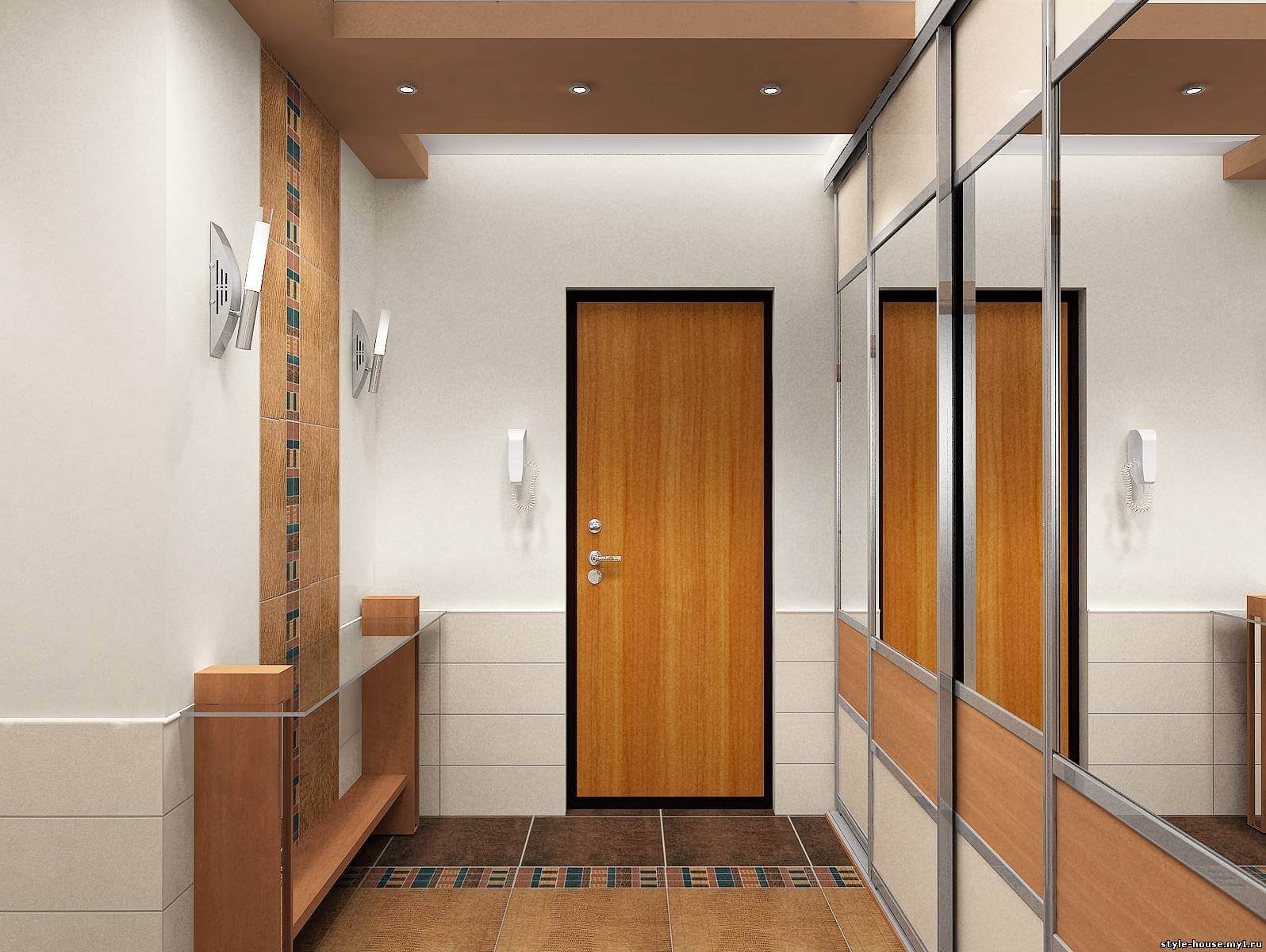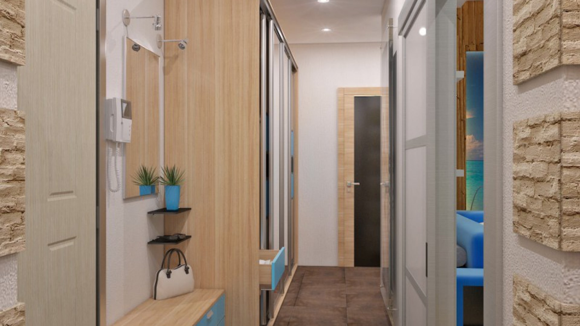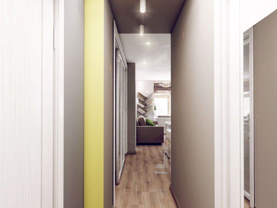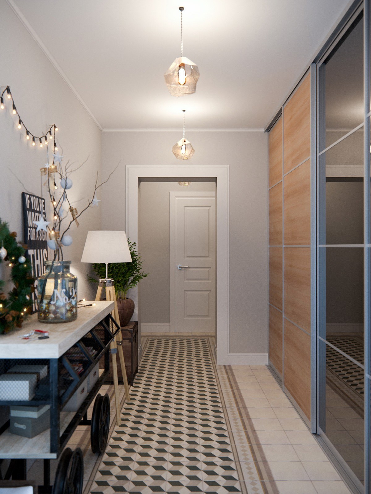 Интерьер прихожей переходящей в кухню в кирпичном стиле