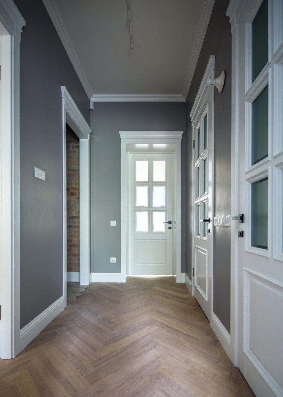 Голубые обои в коридоре с коричневыми дверями (48 фото)