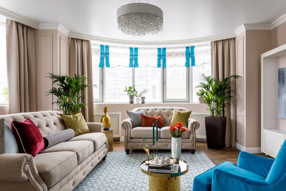 Гостиная с эркером неоклассика в интерьере (49 фото)