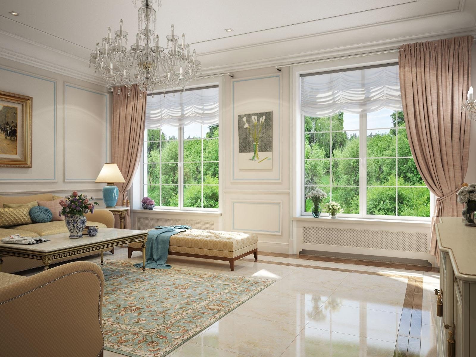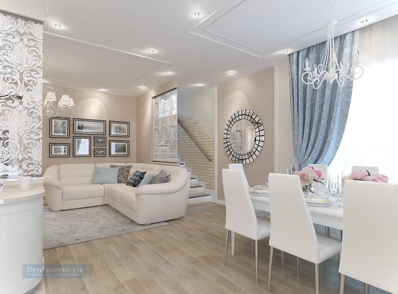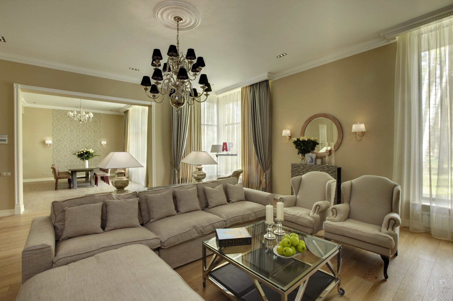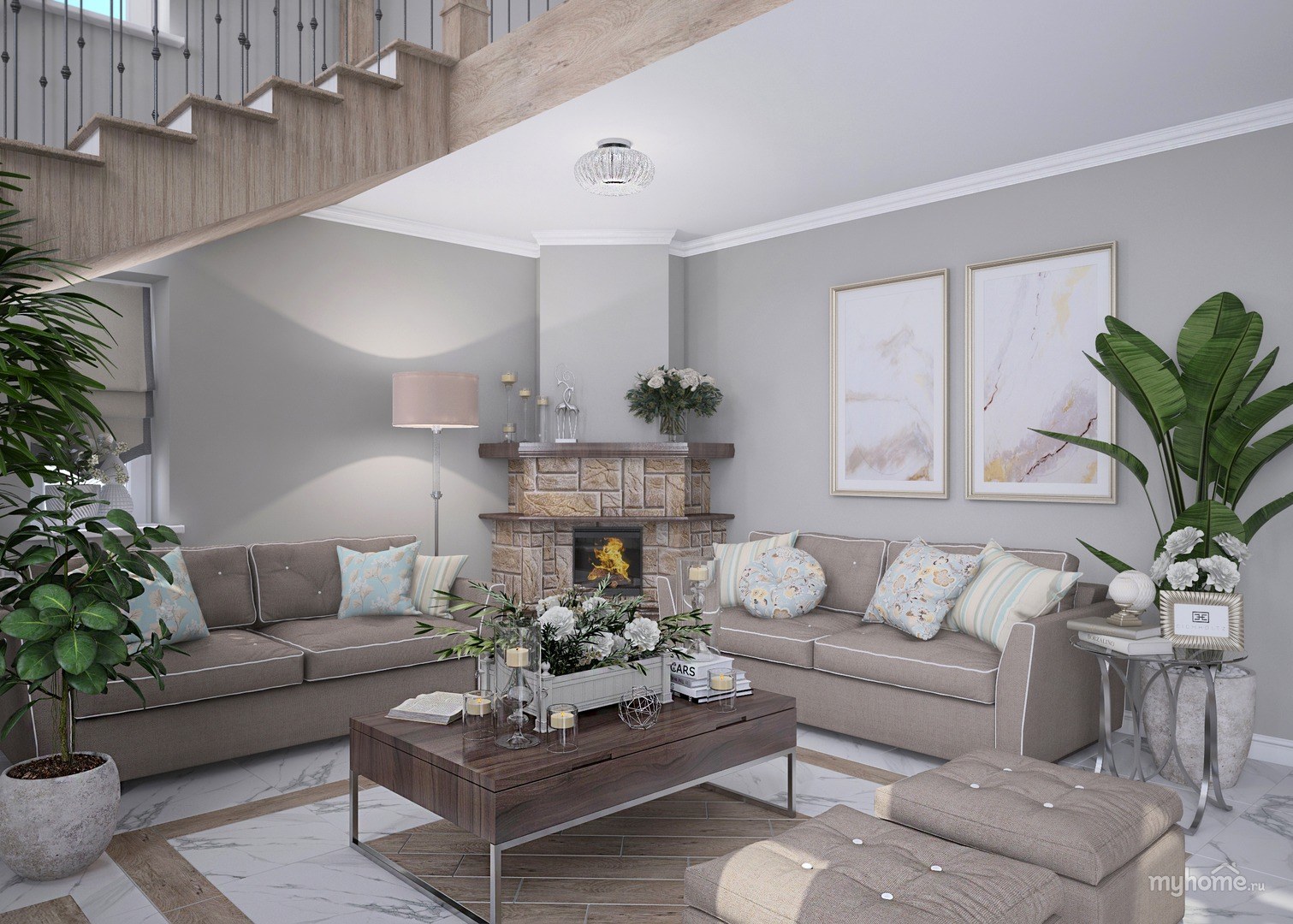 Гостиная в современном стиле в светлых тонах в загородном доме