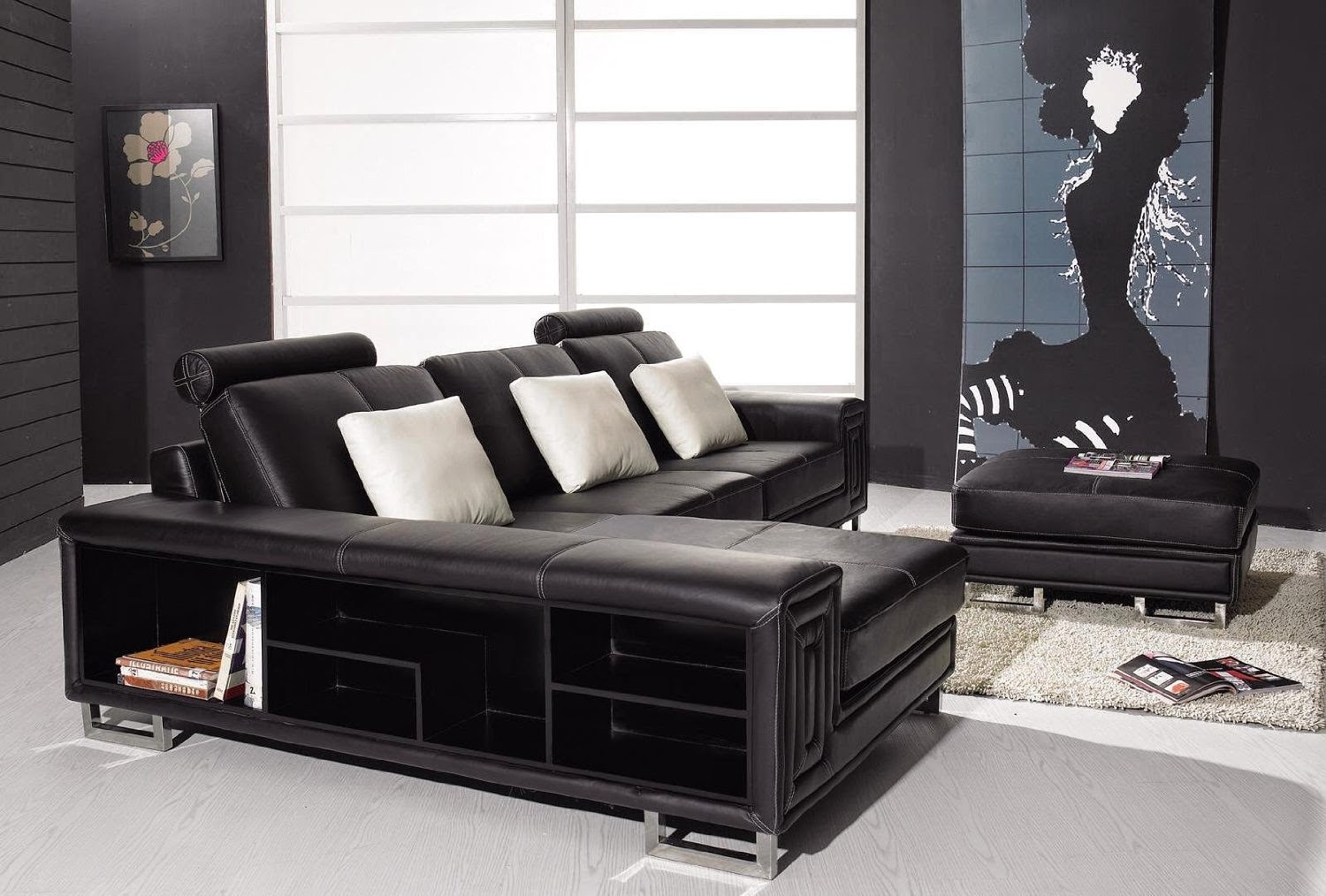 Черный кожаный модульный диван