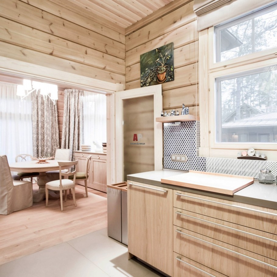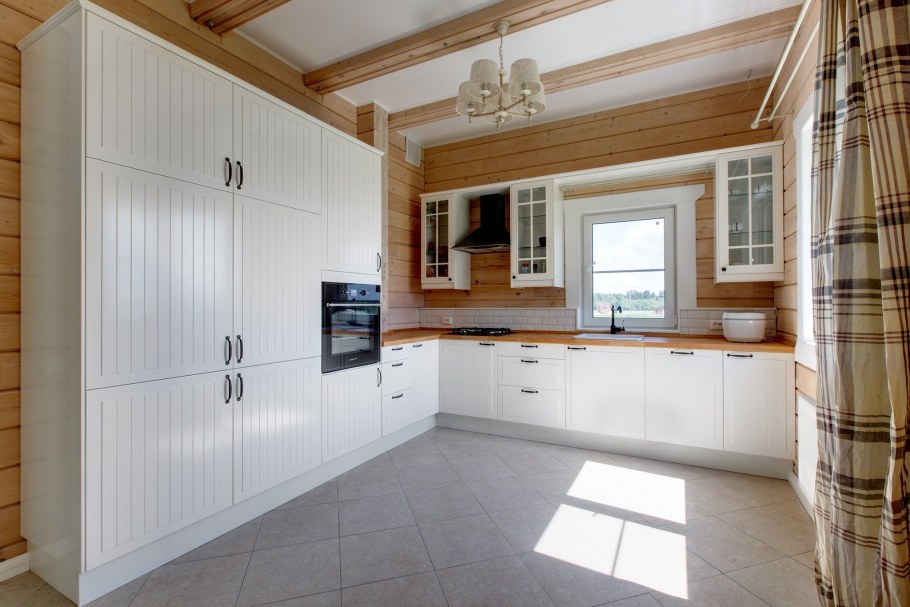 Светлая кухня в доме из клееного бруса