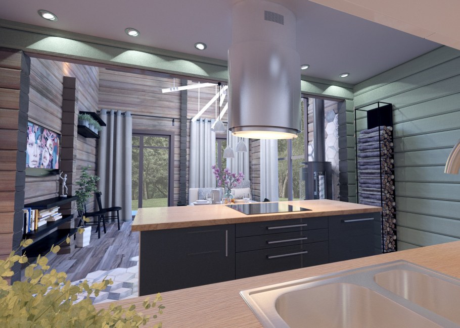 Дом из клееного бруса кухня гостиная интерьер