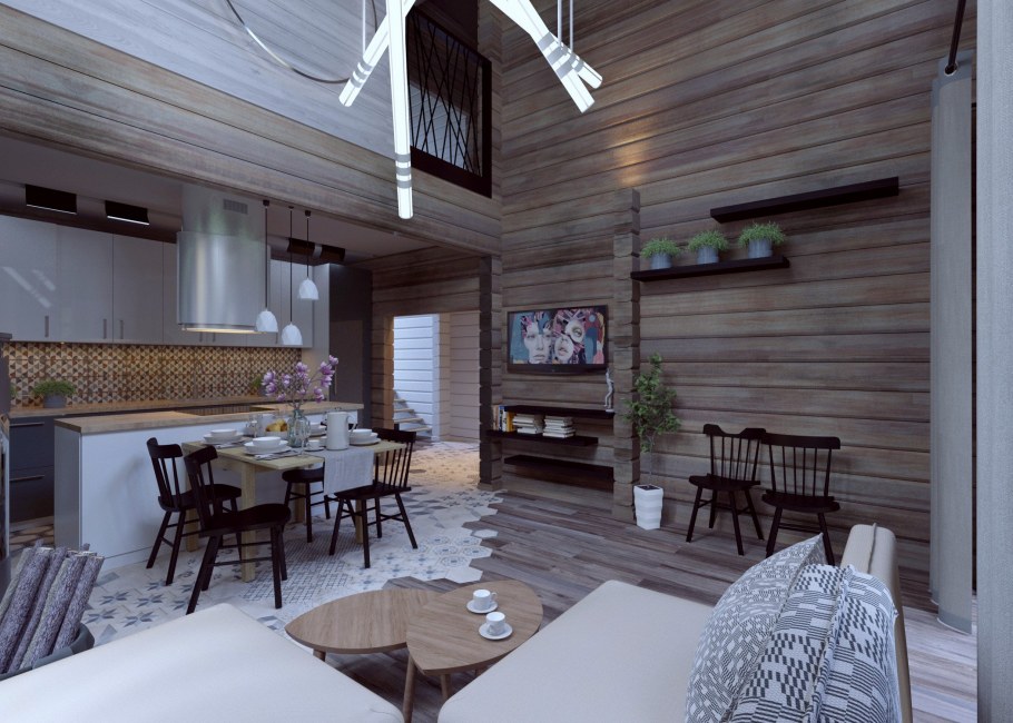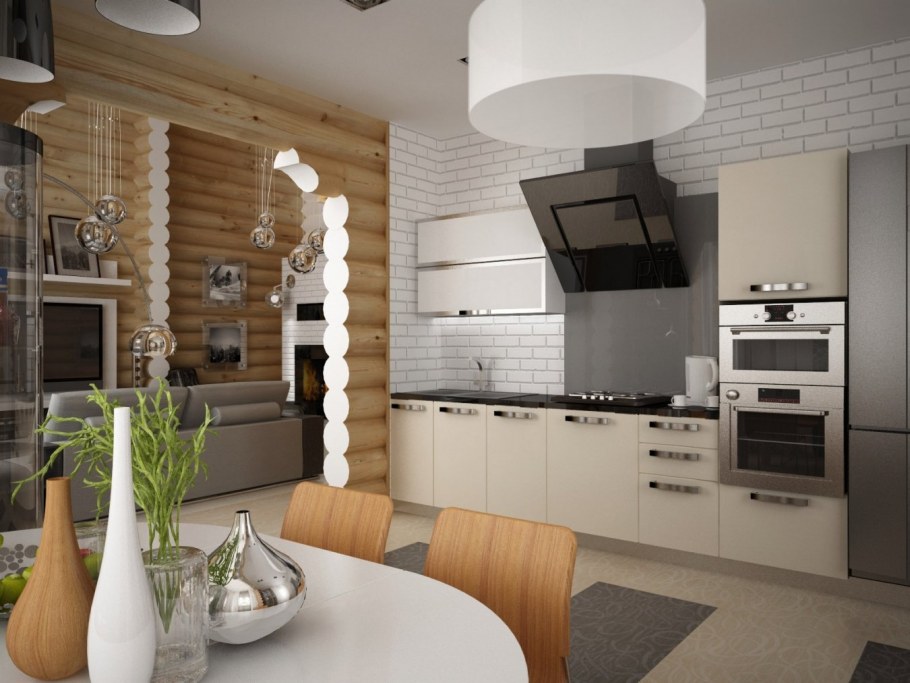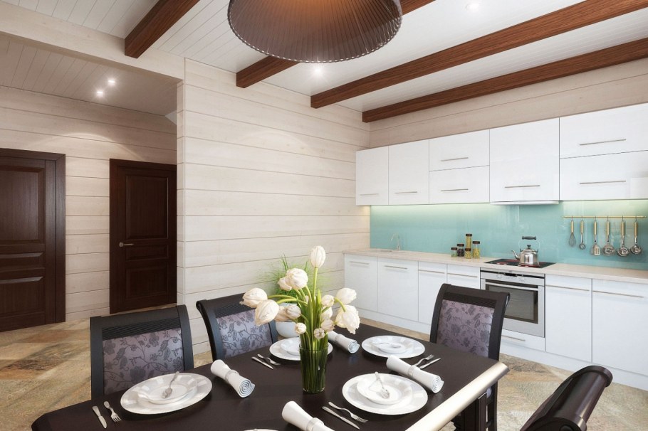 Интерьер кухни гостиной в доме из клееного бруса
