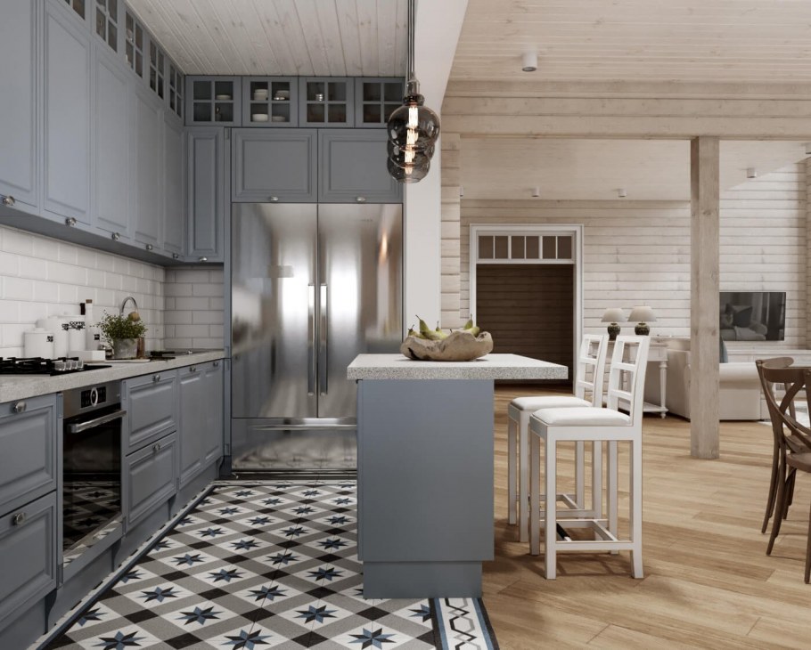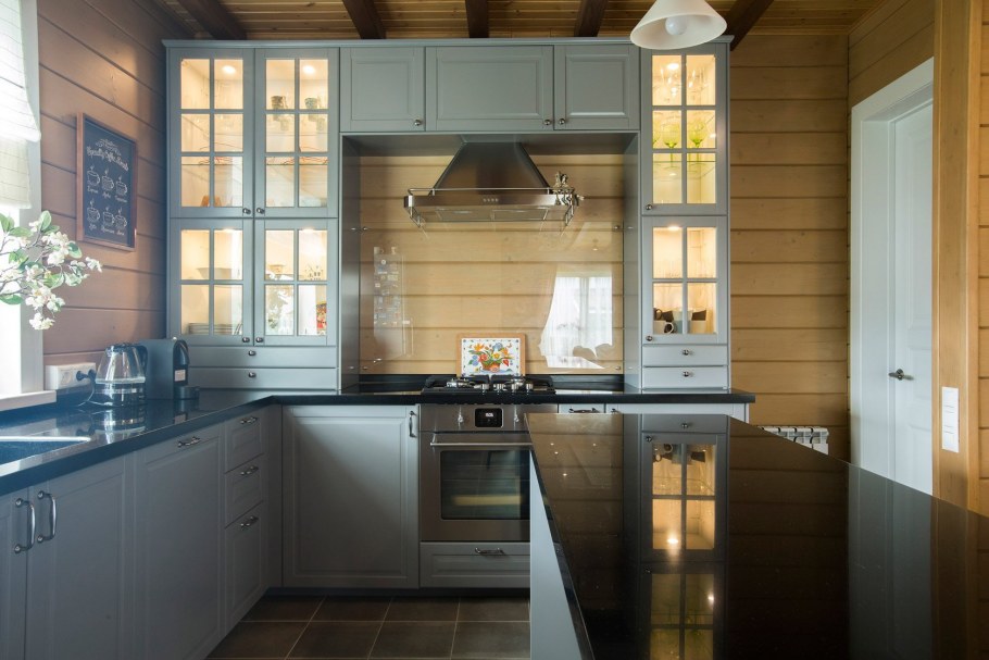 Серая кухня в деревянном доме