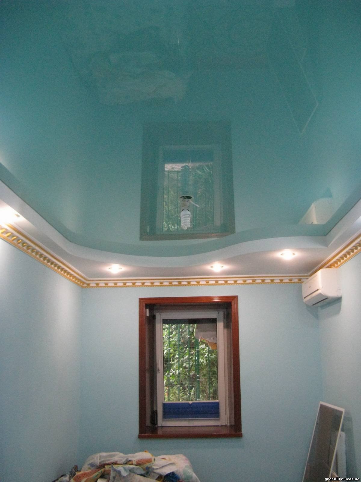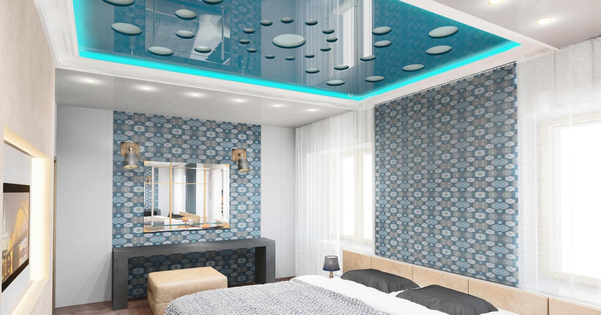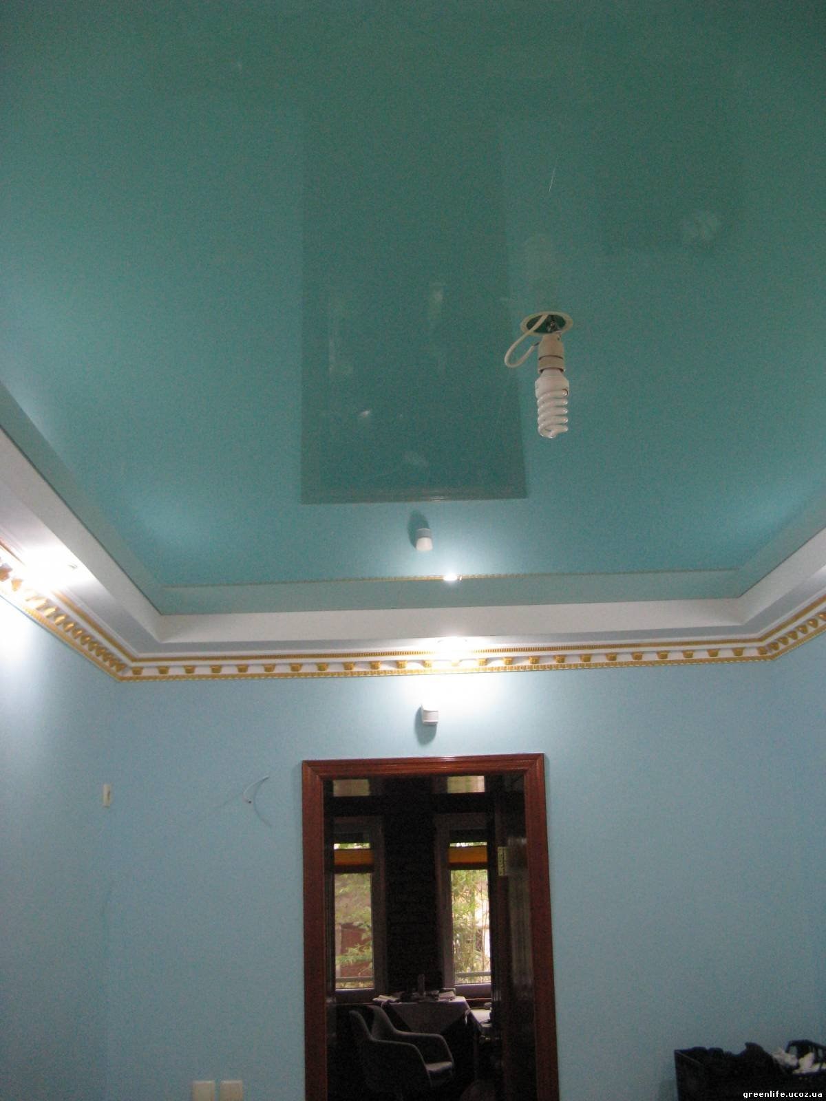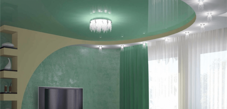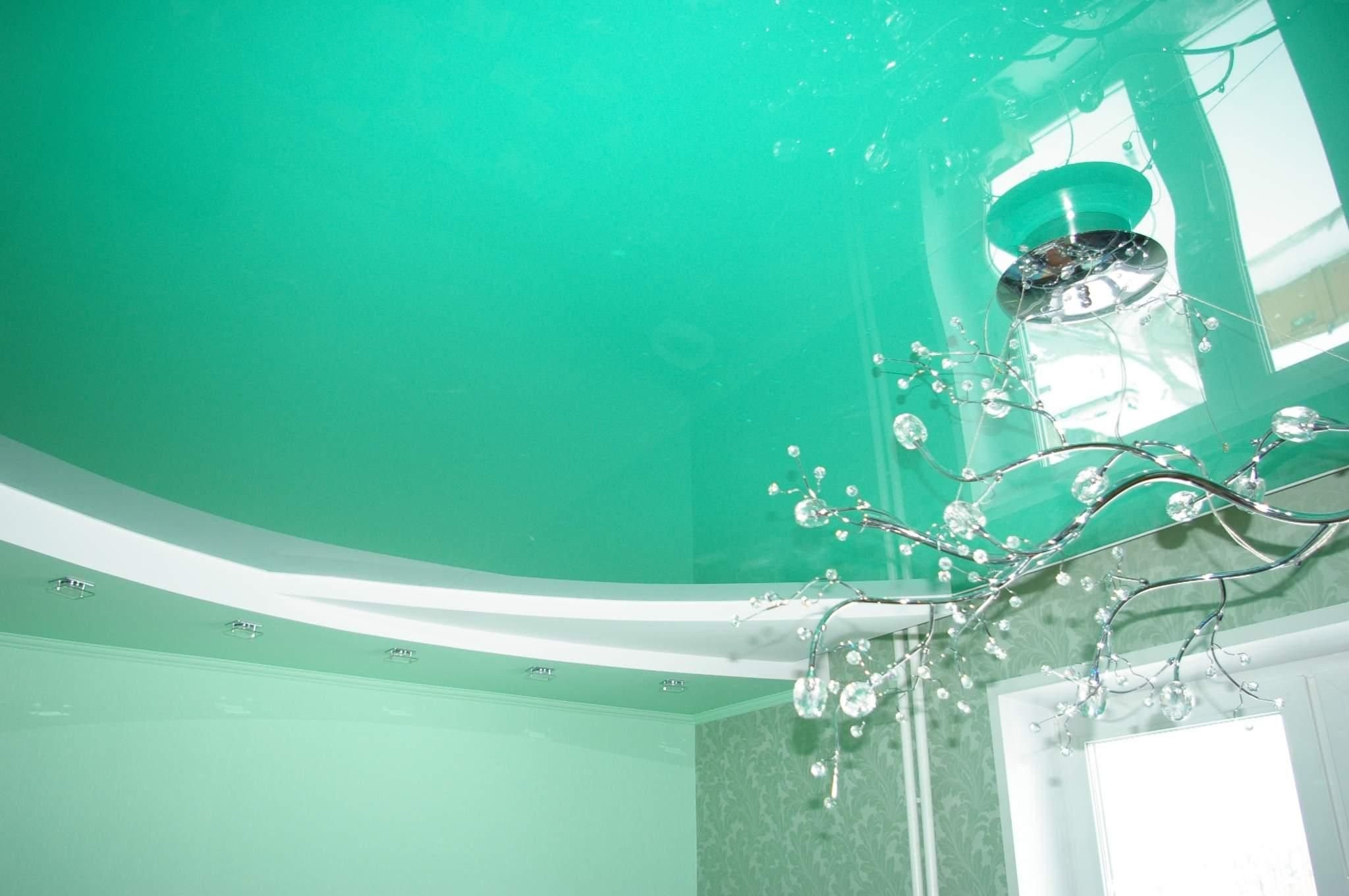 Интерьер с синим глянцевым натяжным потолком и зелеными стенами