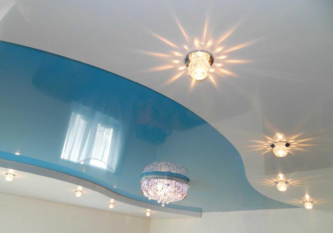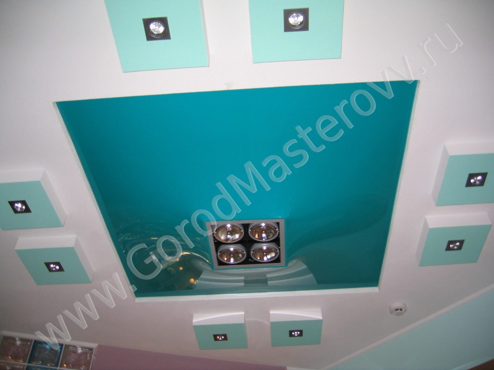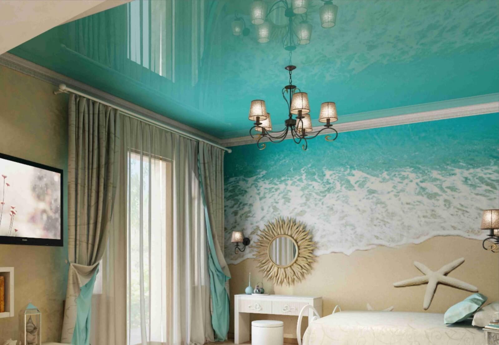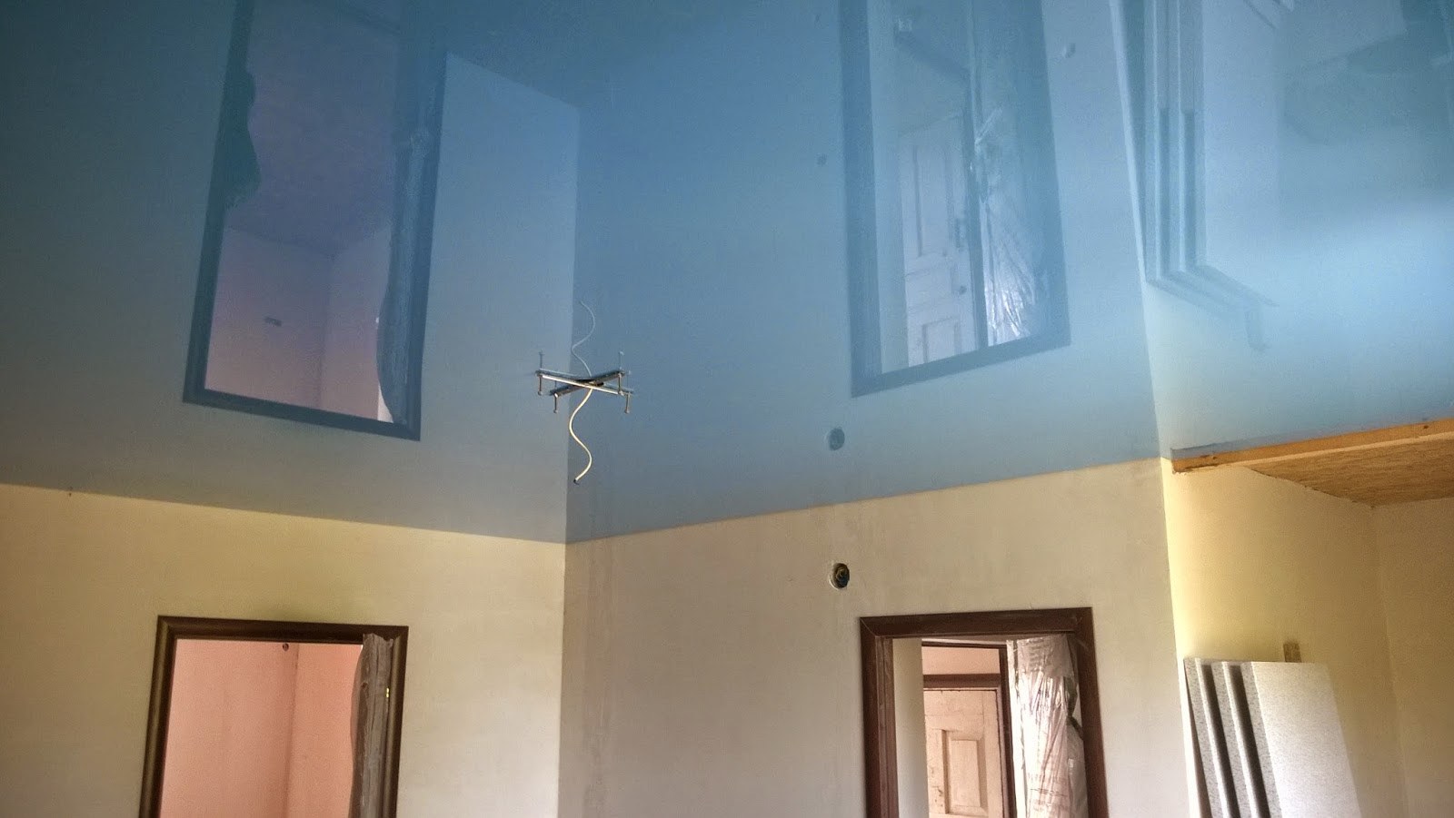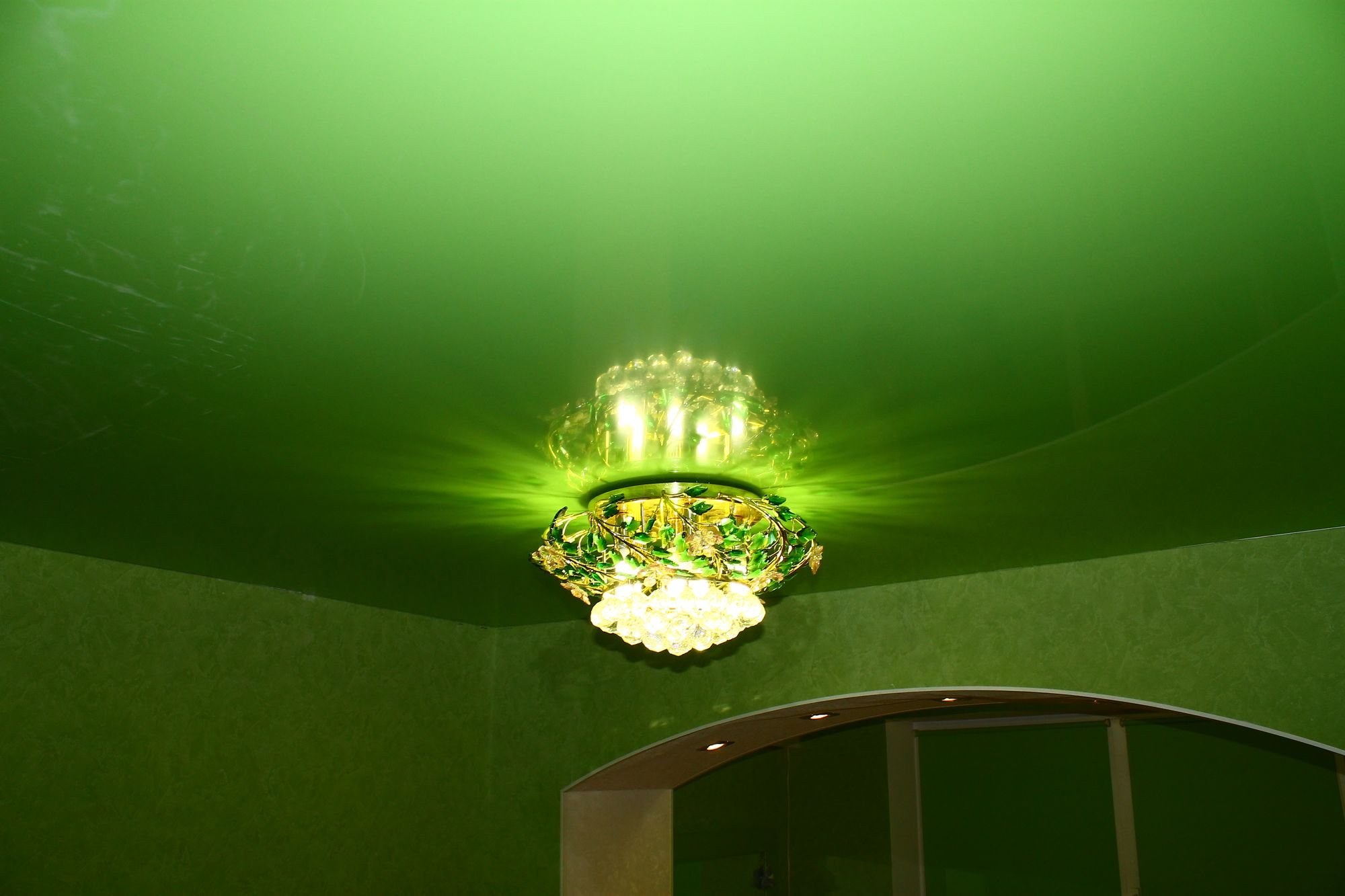 Интерьер с синим глянцевым натяжным потолком и зелеными стенами