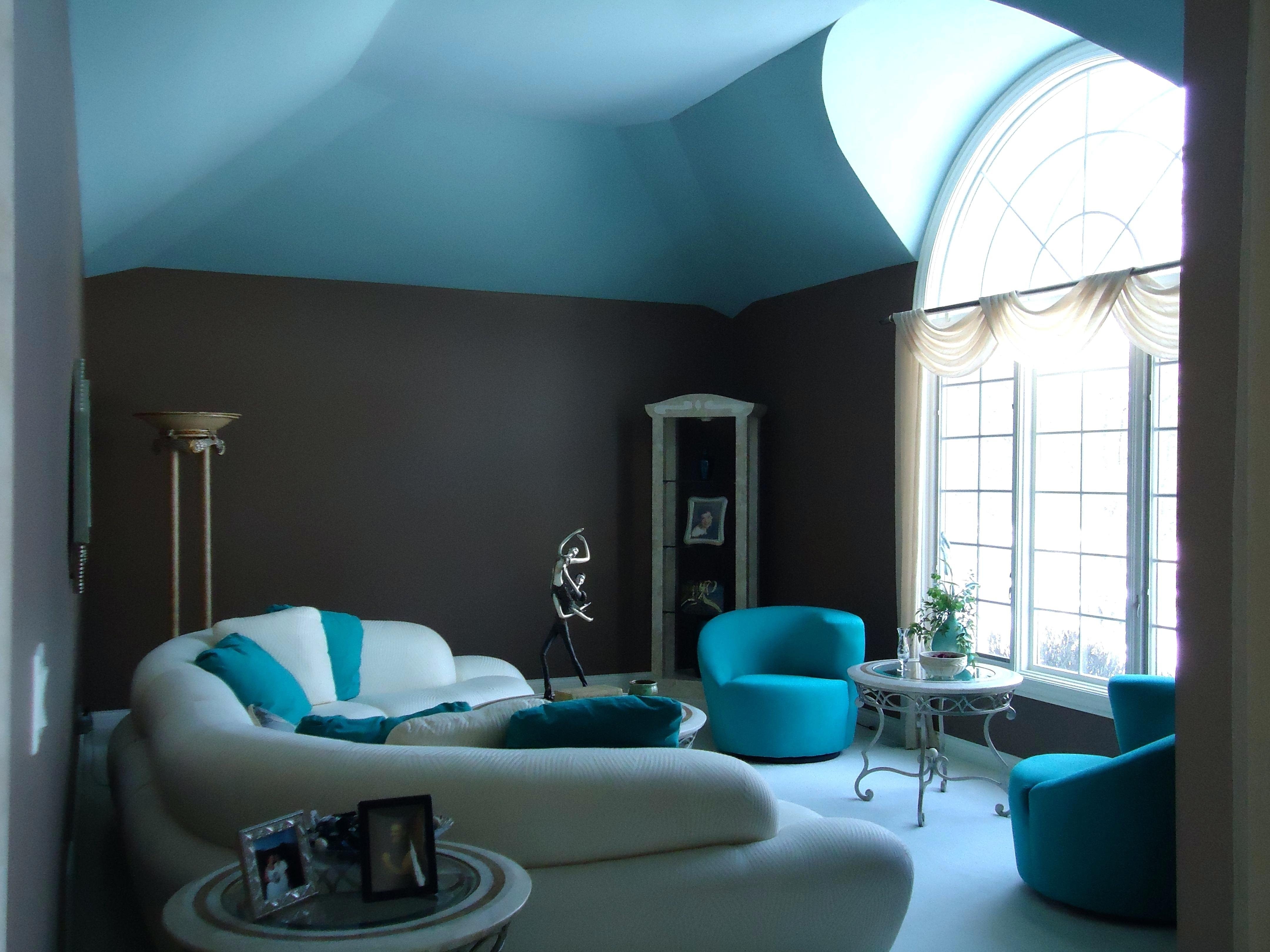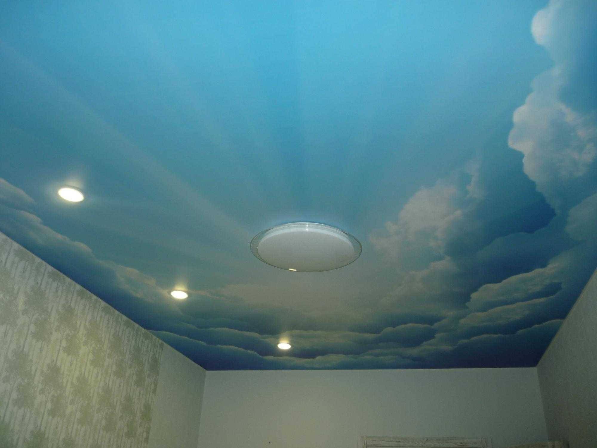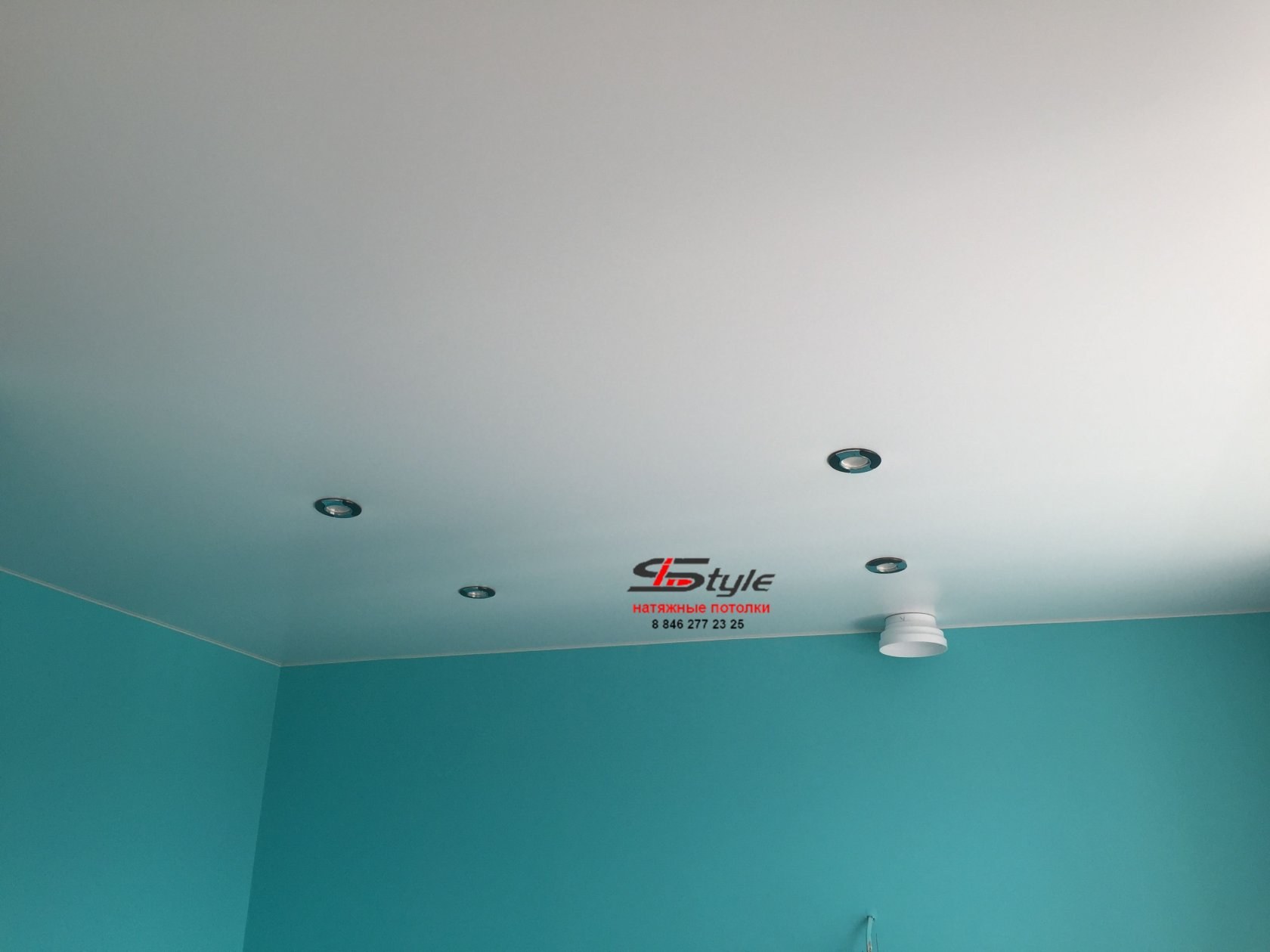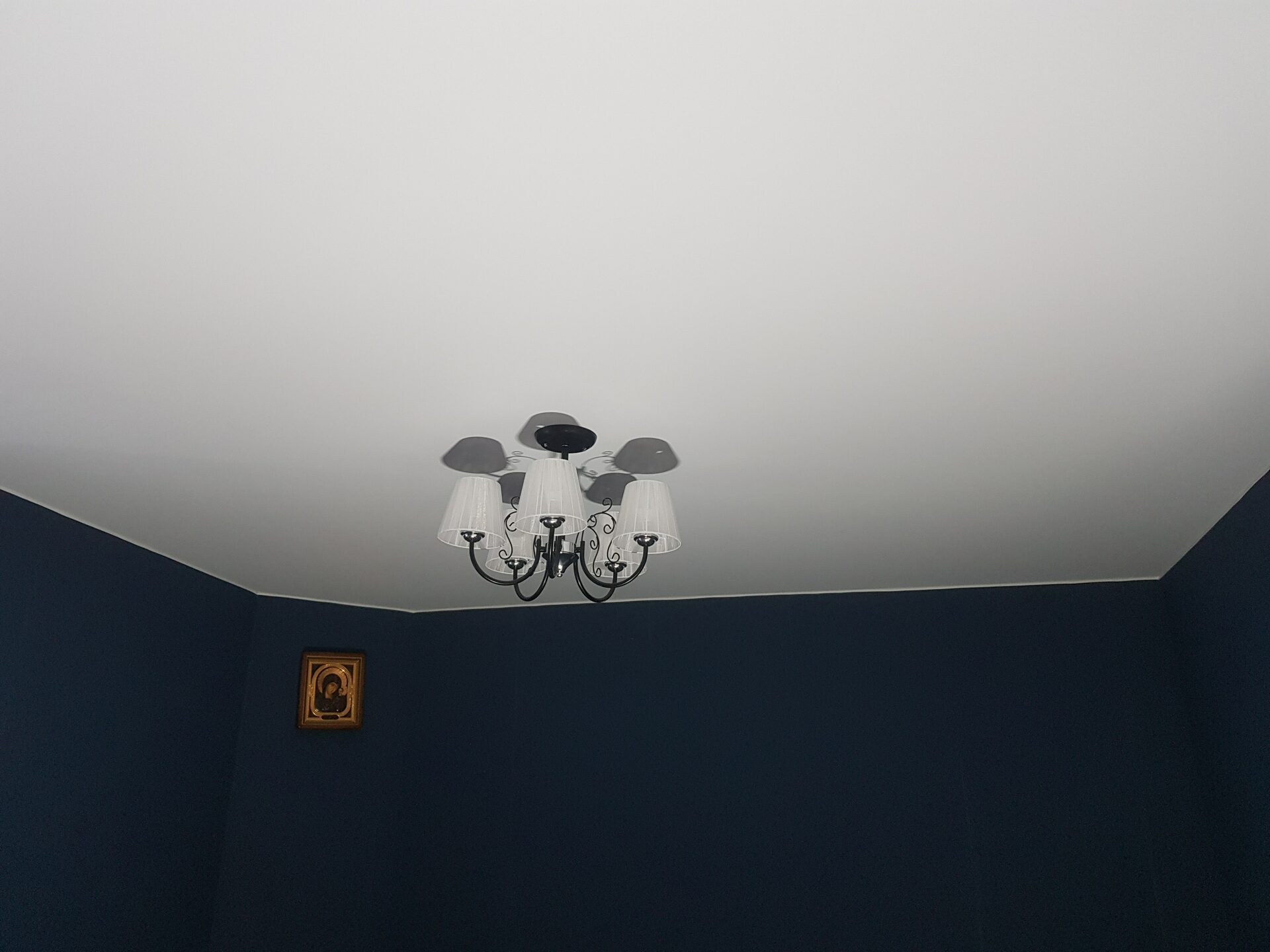 Интерьер с синим глянцевым натяжным потолком и зелеными стенами