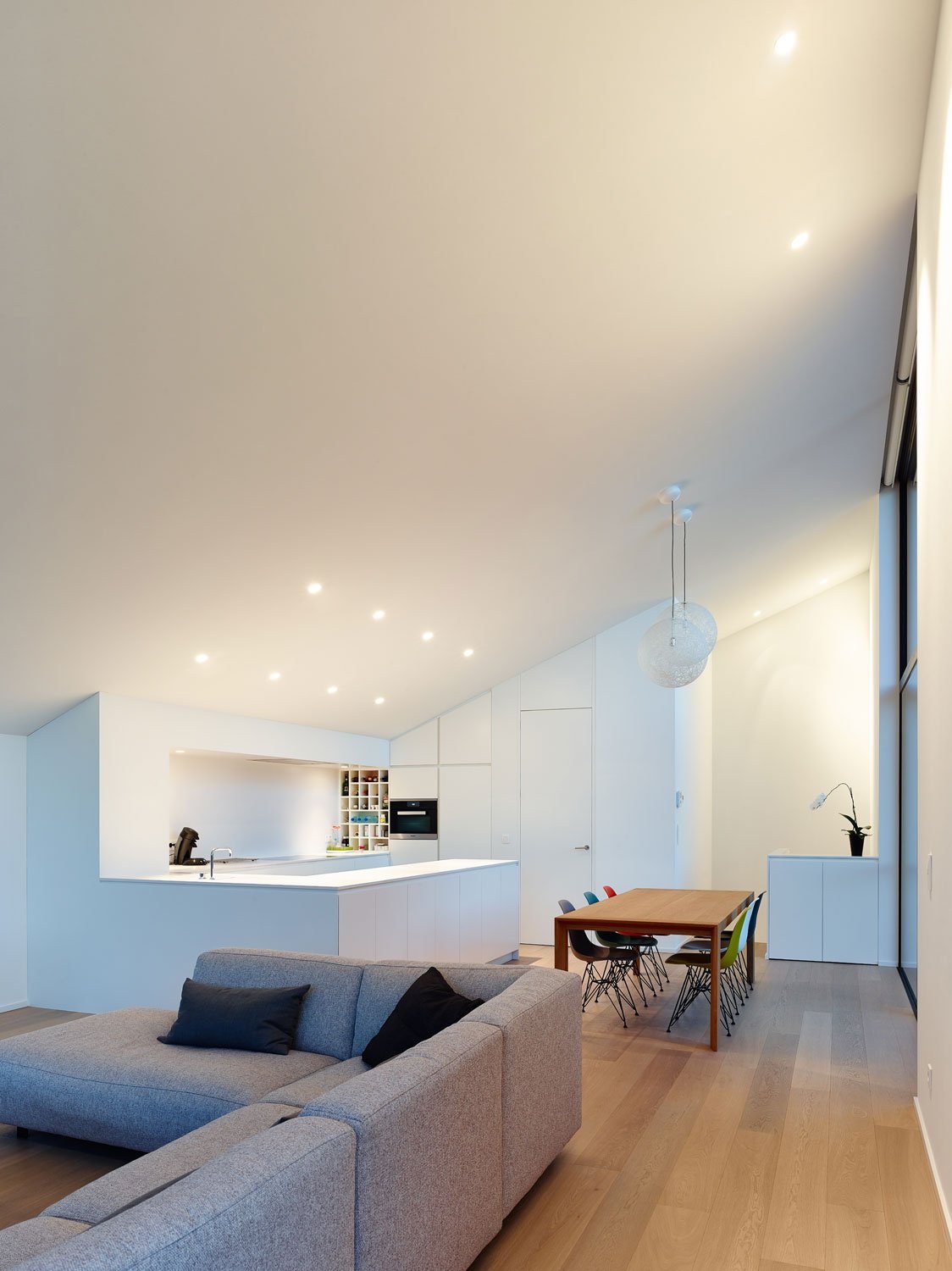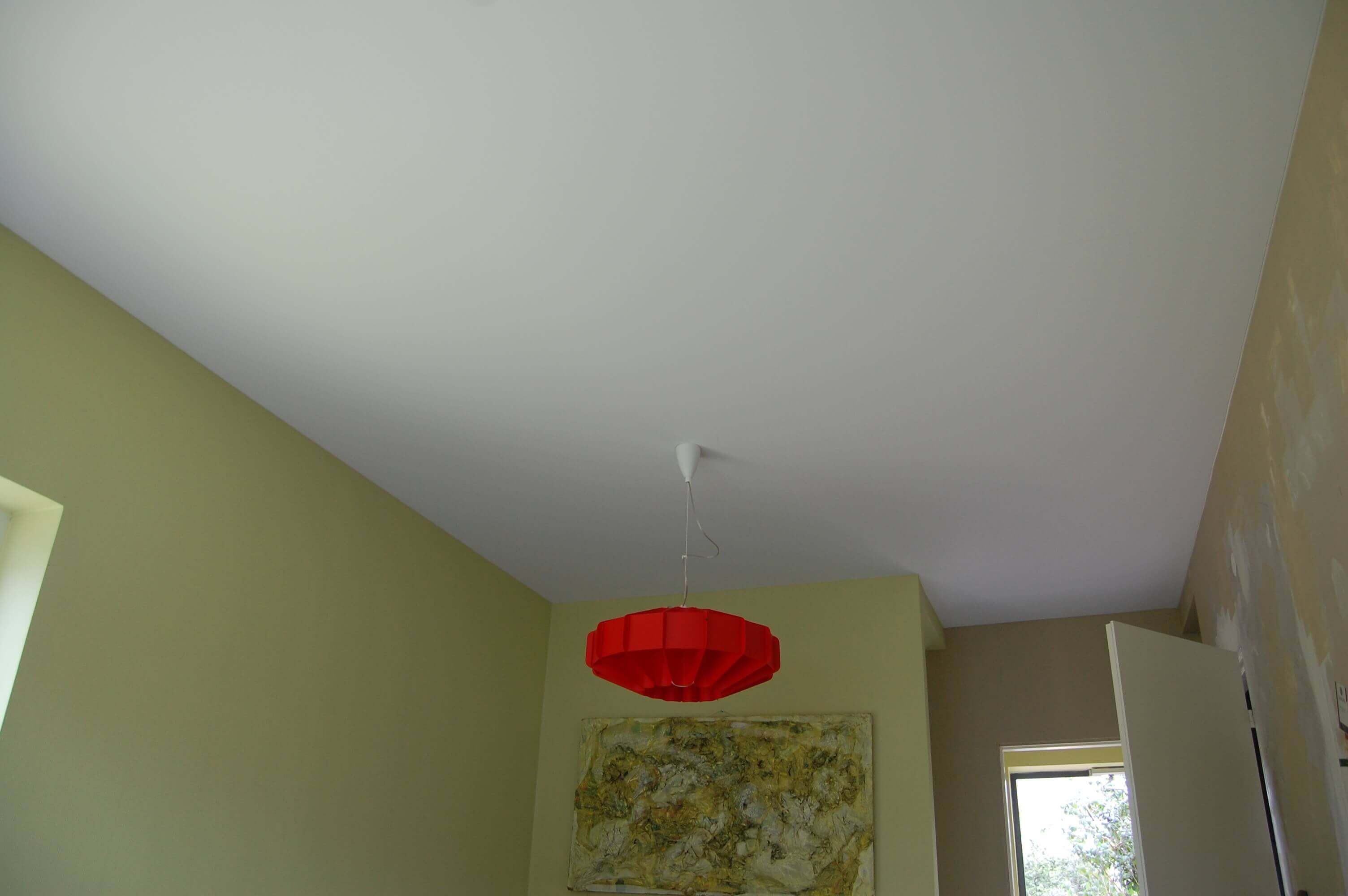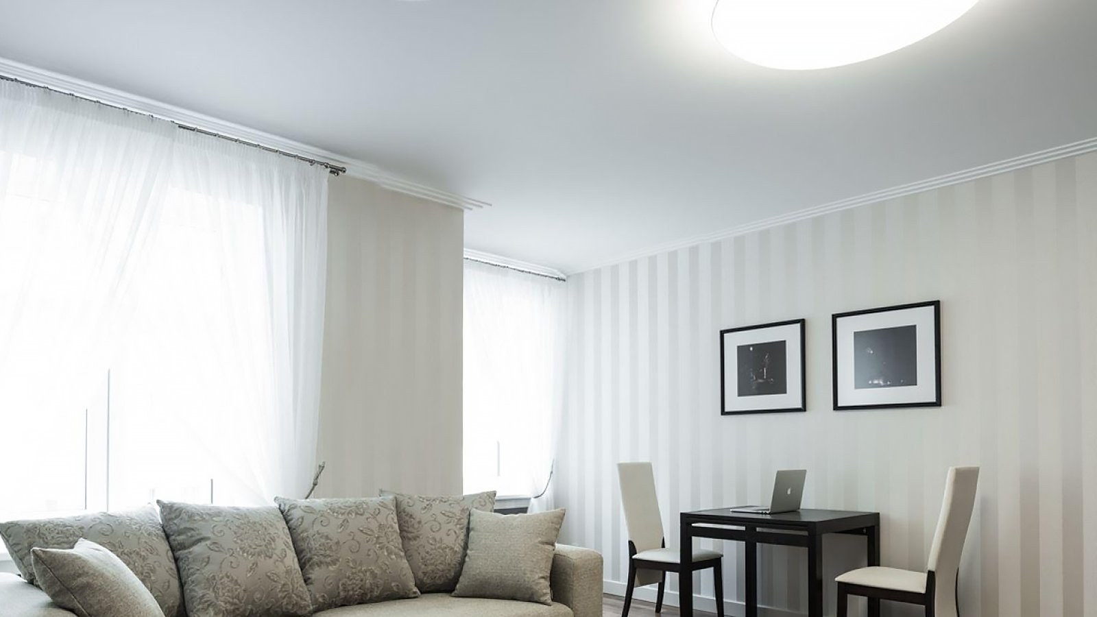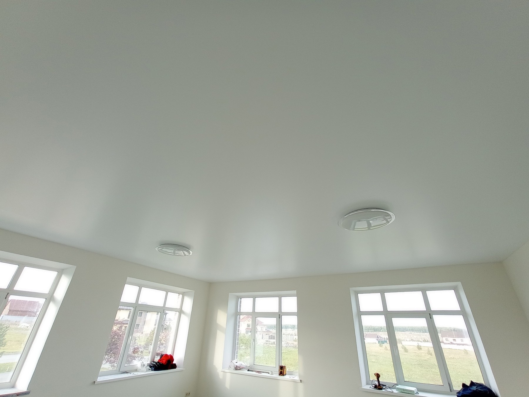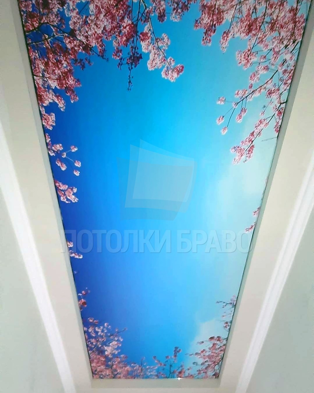 Интерьер с синим глянцевым натяжным потолком и зелеными стенами