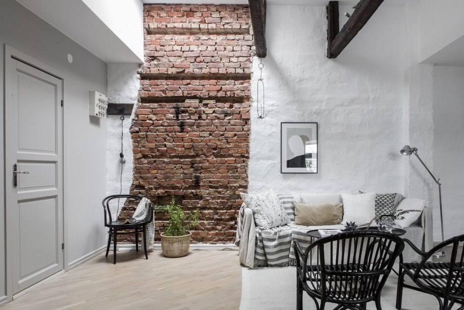 Интерьер с декоративной штукатуркой и ламинатом на стене