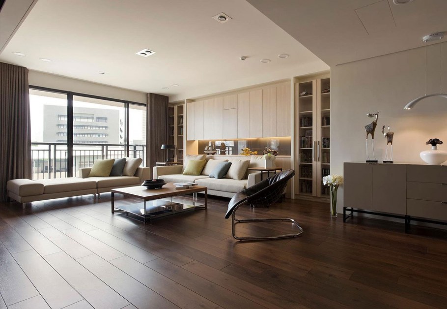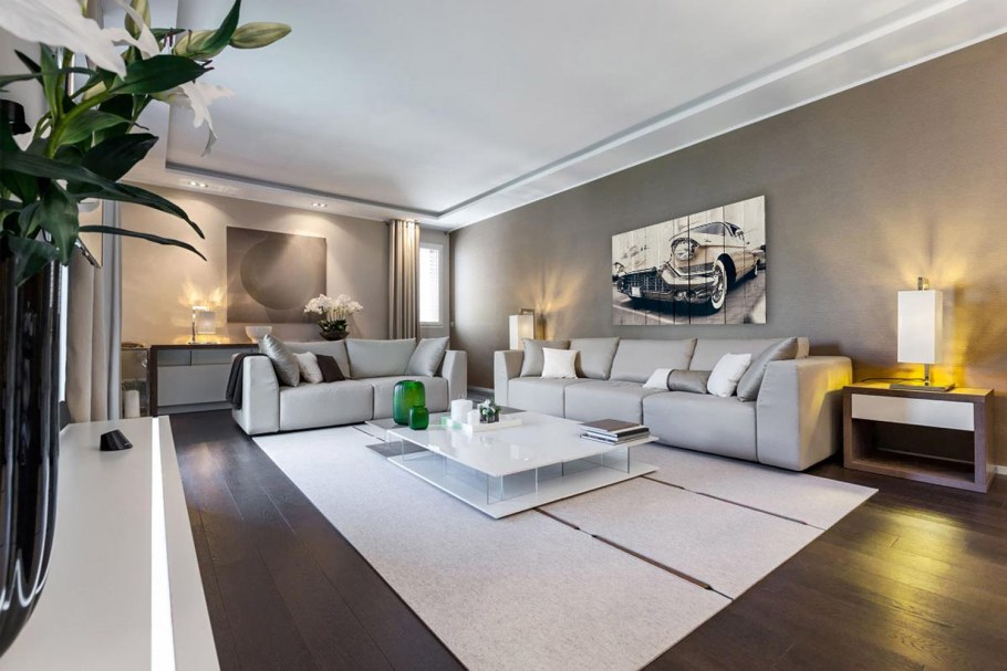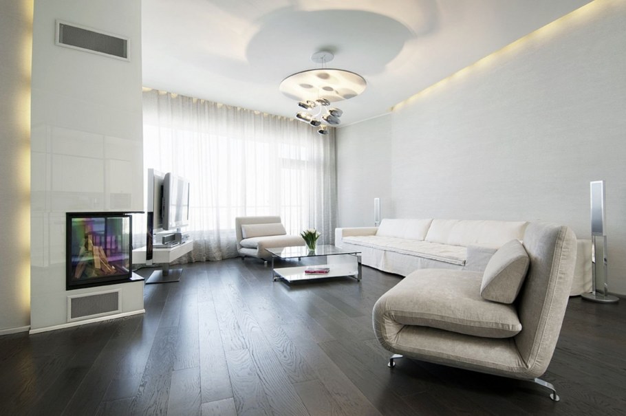 Темный пол и светлые стены в интерьере гостиной (57 фото)
