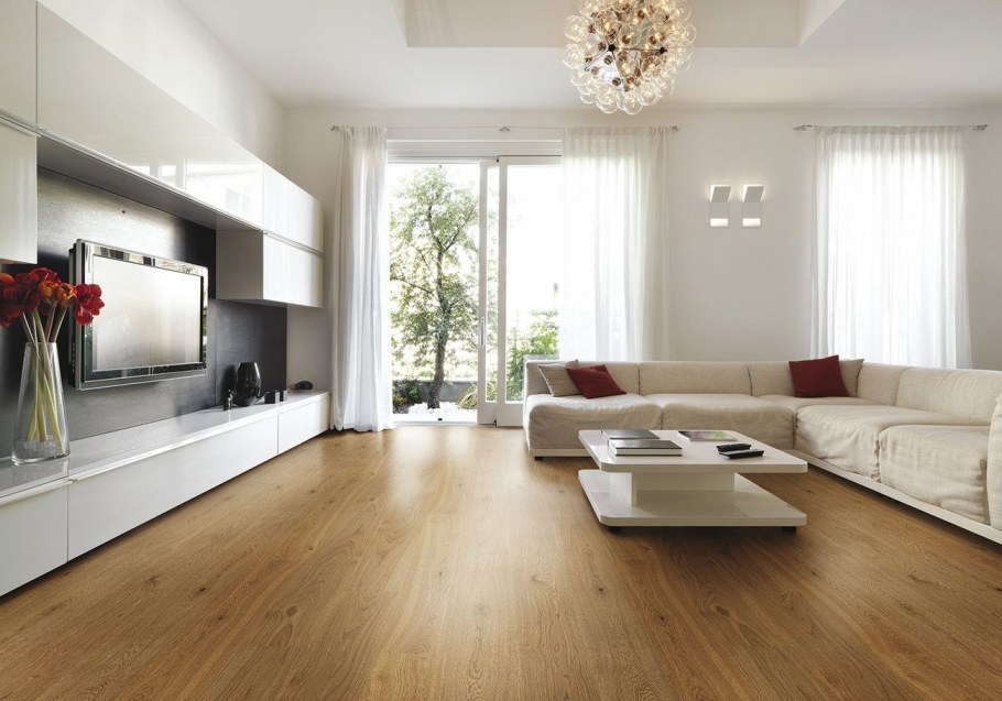 Светлый ламинат в гостиной