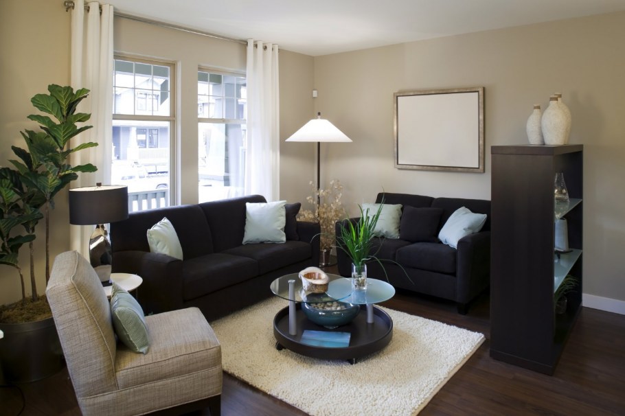 Светлая гостиная с темной мебелью