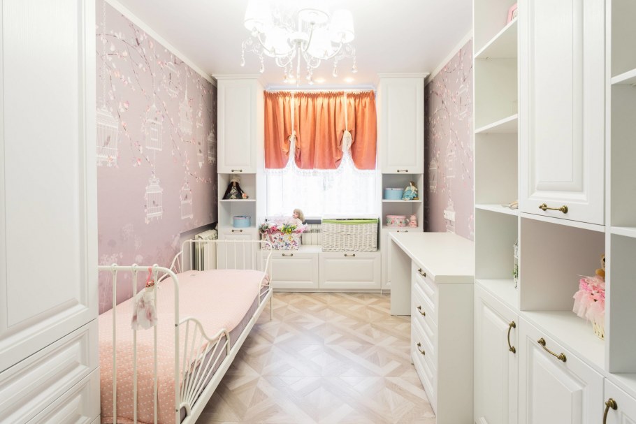Красивый дизайн квадратной детской комнаты в светлых тонах