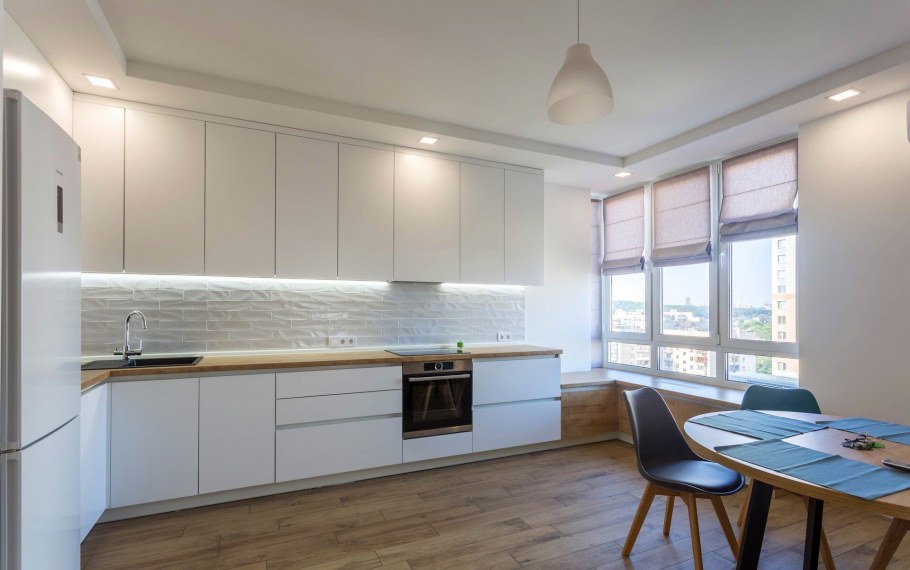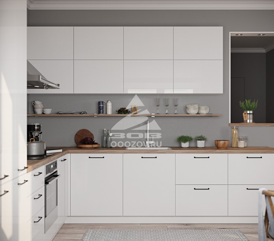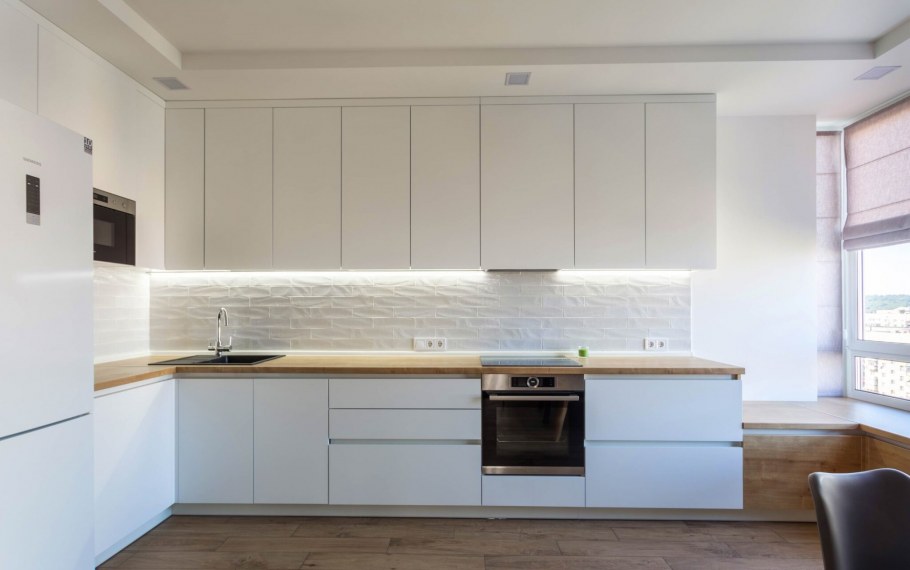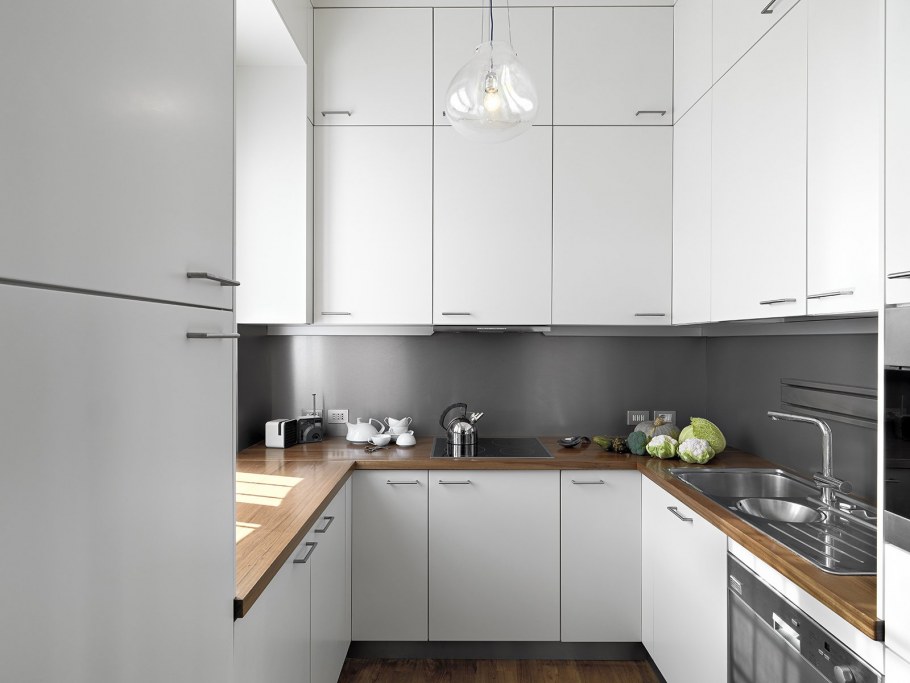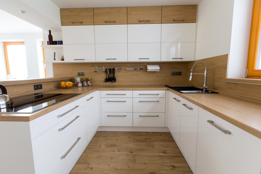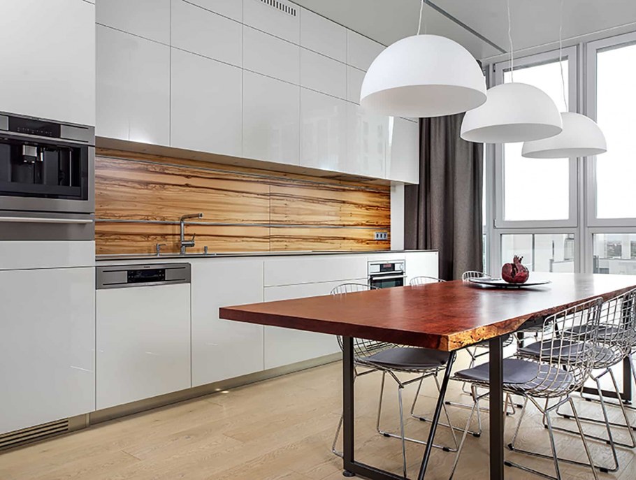 Кухни белые глянцевые с деревянной столешницей в интерьере (36 фото)