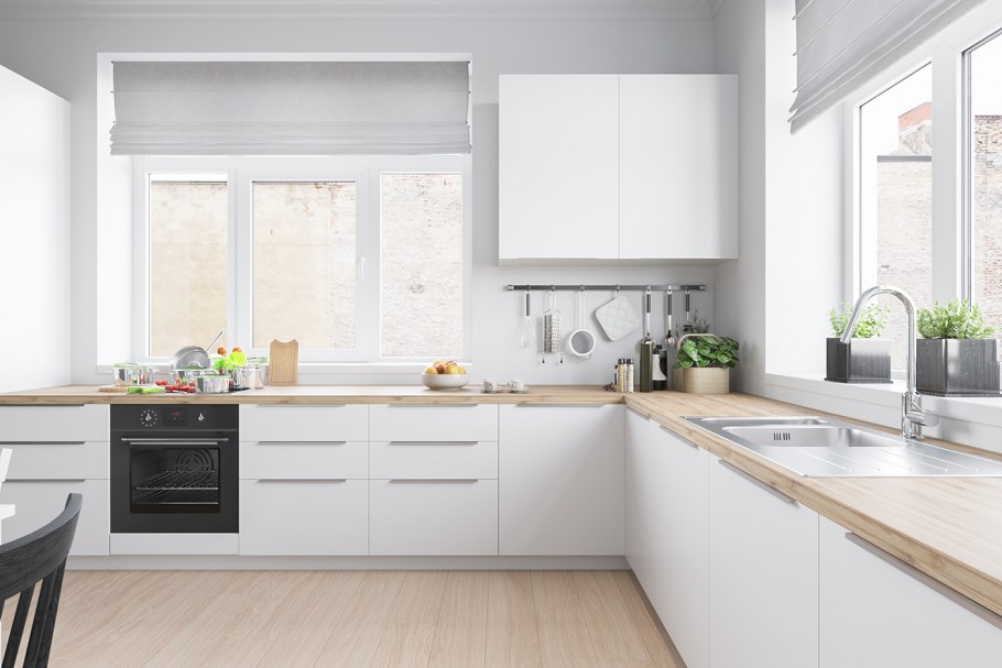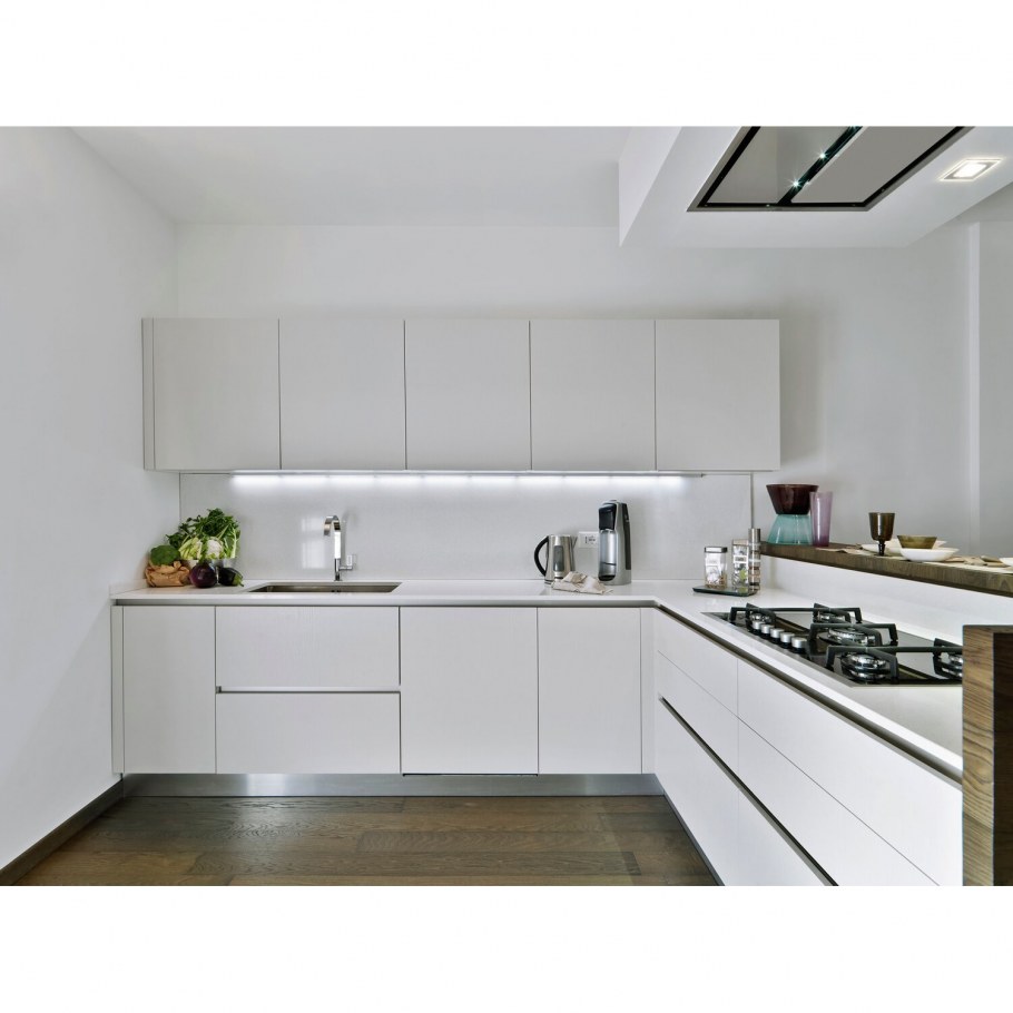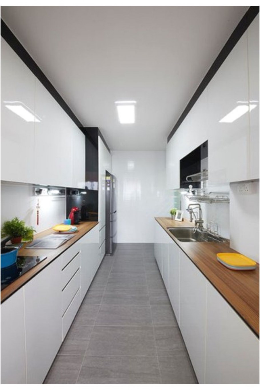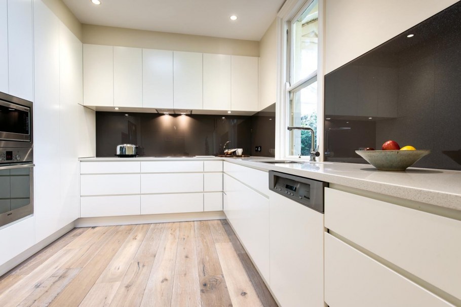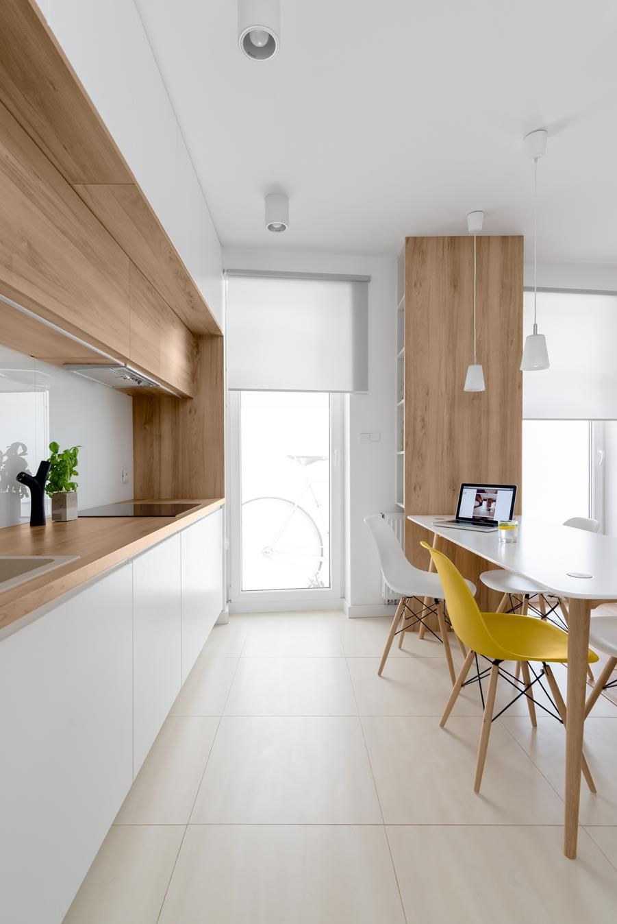 Кухни белые глянцевые с деревянной столешницей в интерьере (36 фото)