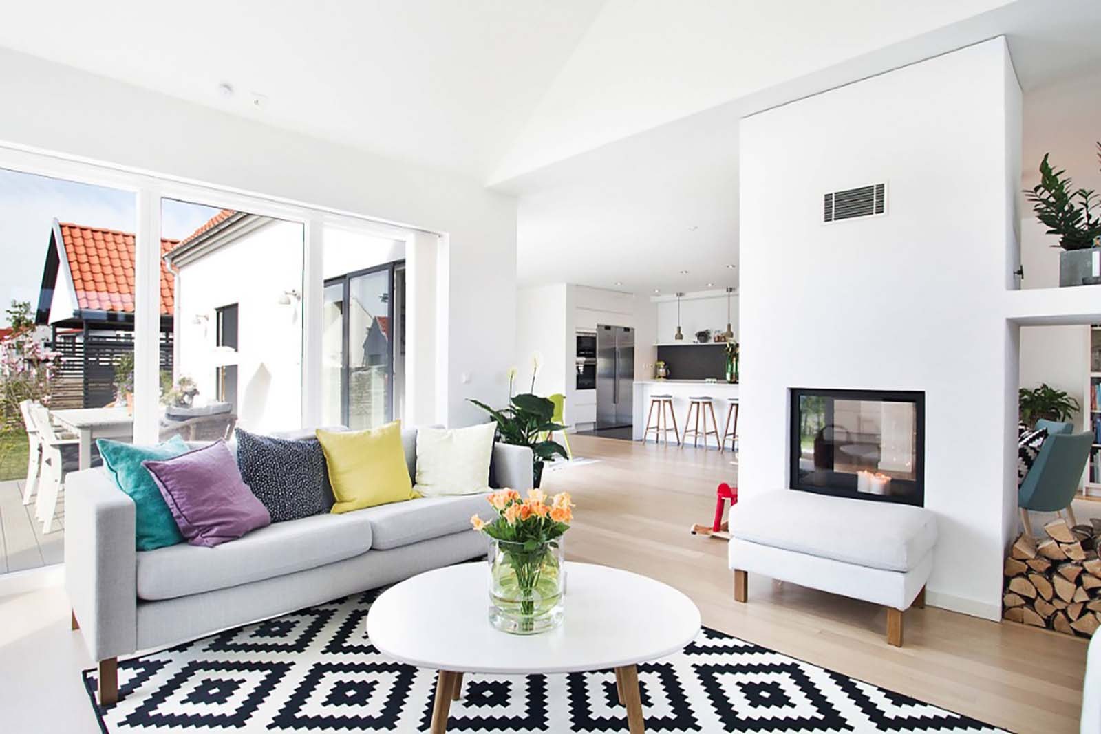 Живые цветы в гостиной интерьер белая мебель