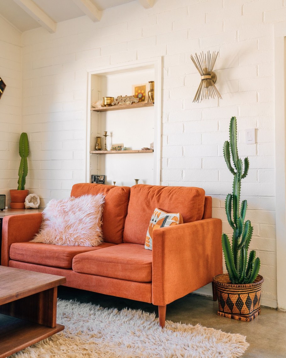 Рыжий диван в интерьере гостиной с чем сочетать (55 фото)