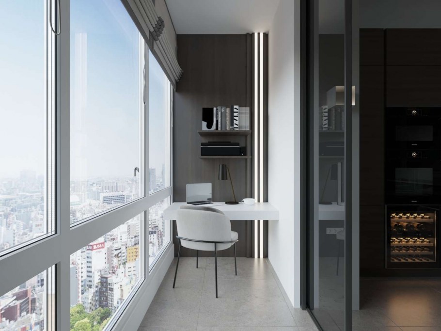 Утепленный балкон в темных тонах в интерьере (32 фото)