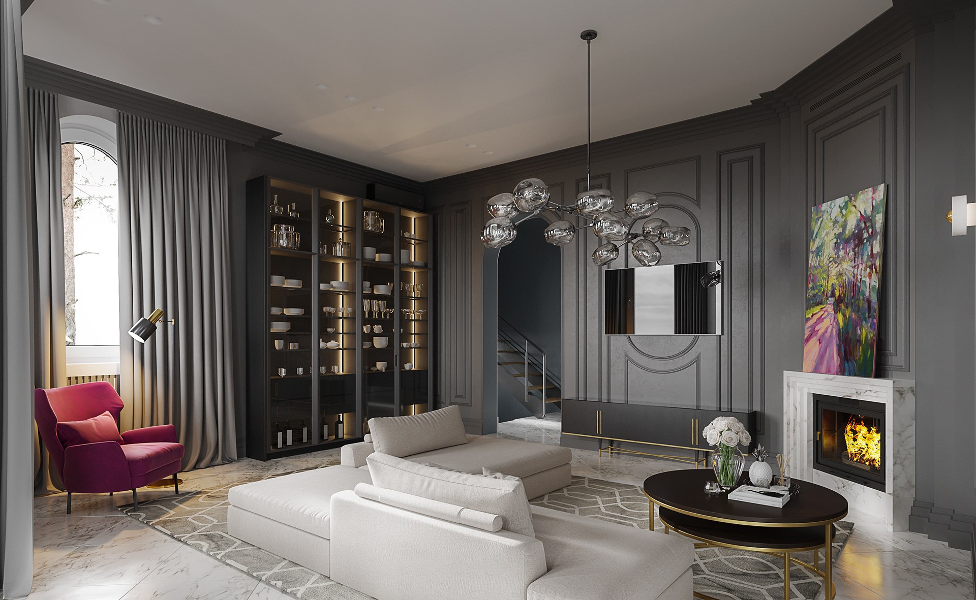 Гостиная в доме с камином тенденции 2020 года
