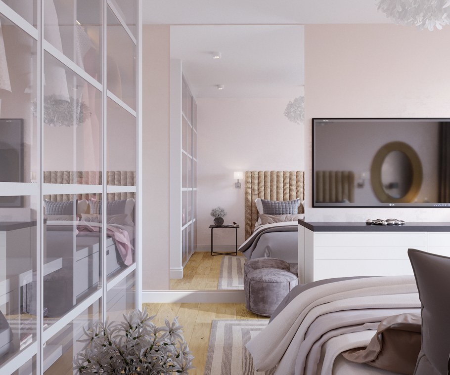 Спальня 9 квадратов для девушки в классическом стиле в светлых тонах